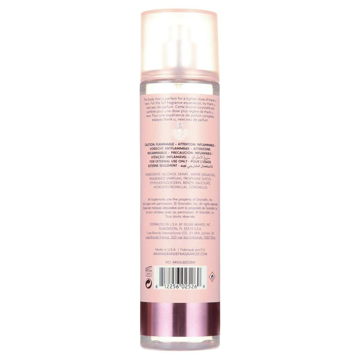 Ariana Grande Thank U Next Body Mist is a Floral Gourmand fragrance with notes of White Pear, Wild Raspberry, Crème de Coconut, and Pink Rose Petals. Ideal for a playful and cool scent experience. Features Floral Gourmand fragrance Top notes of White Pear and Wild Raspberry Middle notes of Crème de Coconut and Pink Rose Petals Base notes of Macaroon Sugar and Velvet Musk Alcohol Denat., Water (Aqua/Eau), Fragrance (Parfum), Propylene Glycol, Ethylhexylglycerin, Benzyl Salicylate, Hydroxycitronellal, Citronellol.Ariana Grande Fragrances offers playful and cool scents, perfect for those looking to express their individuality.Apply to pulse points like the wrist, chest, and neck.CAUTION: FLAMMABLE. FOR EXTERNAL USE ONLY.