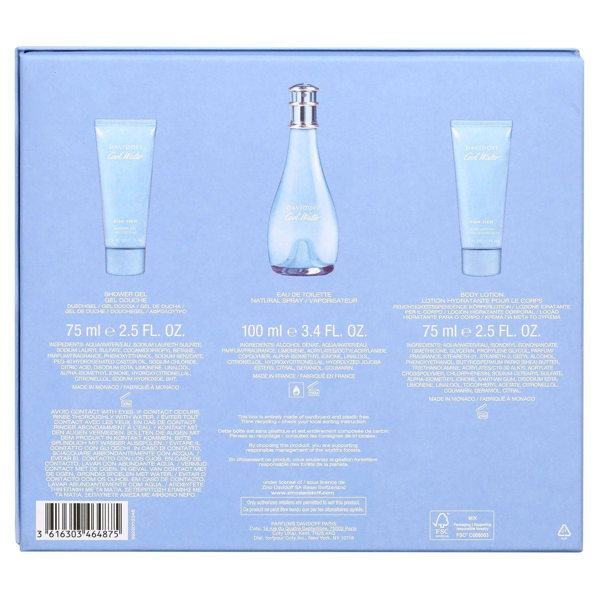 Aqua/Water/Eau, Sodium Laureth Sulfate, Sodium Lauryl Sulfate, Cocamidopropyl Betaine, Parfum/Fragrance, Phenoxyethanol, Sodium Benzoate, Peg-40 Hydrogenated Castor Oil, Sodium Chloride, Citric Acid, Disodium Edta, Limonene, Linalool, Alpha-Isomethyl Ionone, Hydroxycitronellal, Citronellol, Sodium Hydroxide, Bht.Davidoff: Renowned for its iconic fragrances and luxury lifestyle products.Showergel: Lather onto wet skin and rinse. Body Lotion: Apply to clean skin. EDT: Spray onto pulse points.Avoid Contact With Eyes. If Contact Occurs, Rinse Thoroughly With Water.
