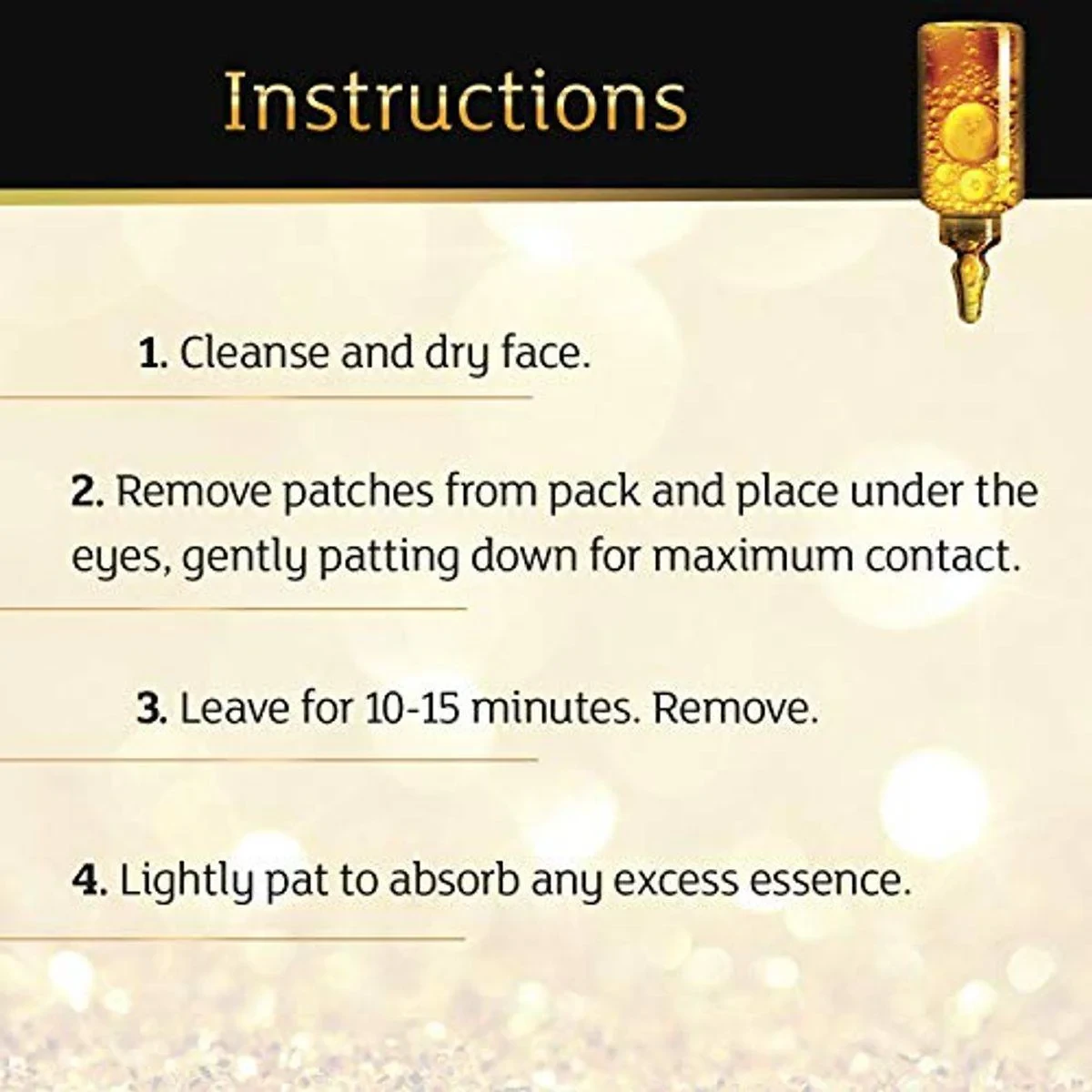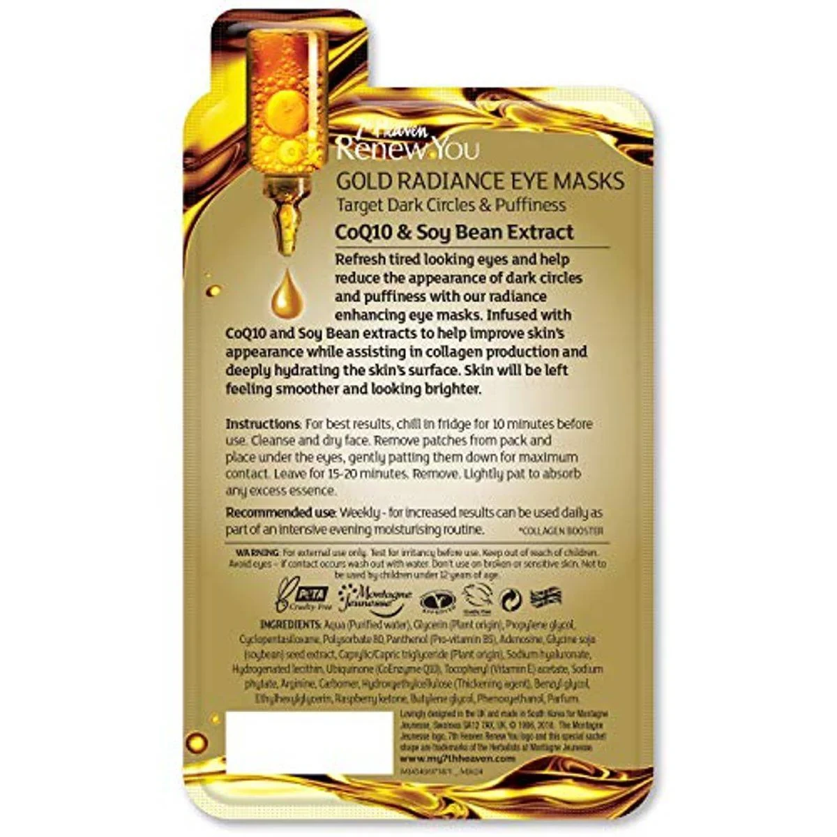 7th Heaven Renew You Gold Radiance Eye Masks are designed to refresh tired eyes and reduce dark circles and puffiness. Infused with CoQ10 and soybean extracts, they improve skin appearance, assist in collagen production, and deeply hydrate the skin's surface, leaving it smoother and brighter. Vegan-approved and cruelty-free. Key Features Natural ingredients Combats dark circles Boosts collagen Weekly use Aqua (Purified water), Glycerin (Plant origin), Propylene Glycol, Arginine, Carbomer, Polysorbate 80, Panthenol (Pro-vitamin B5), Ethylhexylglycerin, Hydroxyethylcellulose, Caprylyl Glycol, Adenosine, Propanediol (Plant origin), Butylene Glycol, Rubus Idaeus (Raspberry) Fruit Extract, Parfum (Fragrance), Caprylic/Capric Triglyceride (Plant origin), Illicium Verum (Anise) Fruit Extract, Lactobacillus/Soybean Ferment Extract, Sodium Hyaluronate, Hydrogenated Lecithin, Ubiquinone (Coenzyme Q-10), Tocopheryl (Vitamin E) Acetate.7th Heaven: Known for innovative skincare solutions using natural ingredients.Chill in fridge for 10 minutes before use. Cleanse and dry face. Apply patches under eyes, pat gently. Leave for 15-20 minutes, then remove and pat excess essence.For external use only. Test for irritancy before use. Keep out of reach of children. Avoid contact with eyes. Not to be used by children under 12 years of age.