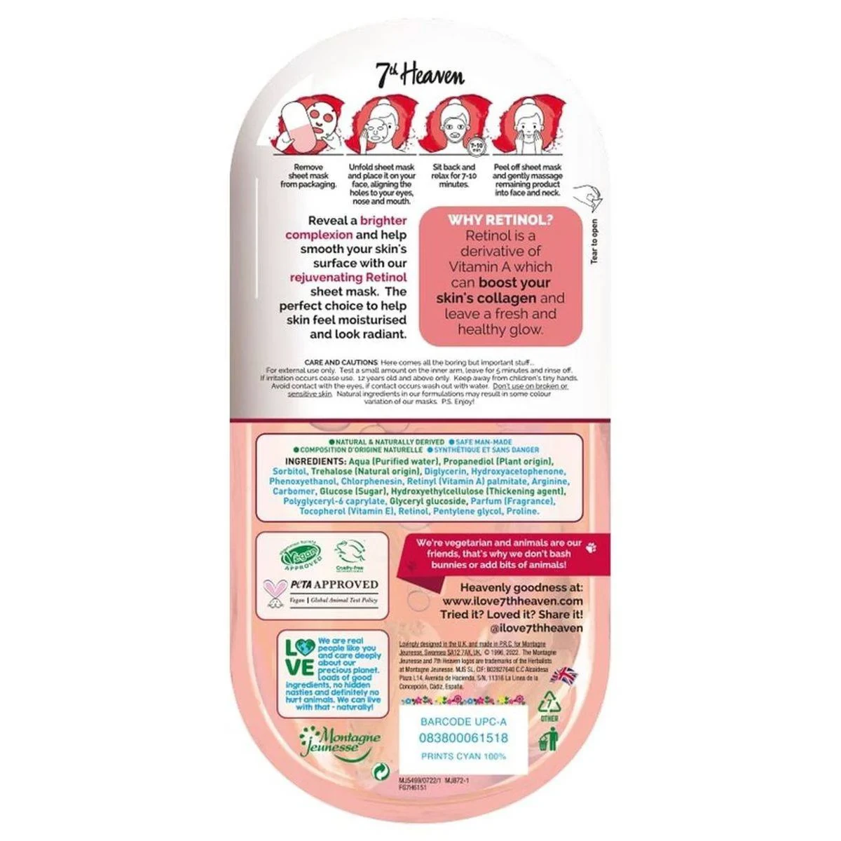 Aqua (Purified Water), Propanediol (Plant Origin), Sorbitol, Trehalose (Natural Origin), Diglycerin, Hydroxyacetophenone, Phenoxyethanol, Chlorphenesin, Retinyl (Vitamin A) Palmitate, Arginine, Carbomer, Glucose (Sugar), Hydroxyethylcellulose (Thickening Agent), Polyglyceryl-6 Caprylate, Glyceryl Glucoside, Parfum (Fragrance), Tocopherol (Vitamin E), Retinol, Pentylene Glycol, Proline.7th Heaven offers natural, cruelty-free beauty products for self-care and wellness.Apply generously to clean, dry skin. Leave on for 7-10 minutes. Peel off and gently massage remaining product into face and neck.For external use only. Test a small amount on the inner arm, leave for 5 minutes and rinse. If irritation occurs, discontinue use. Avoid contact with eyes. If contact occurs, rinse thoroughly with water. Do not use on broken or sensitive skin. Keep out of reach of children.
