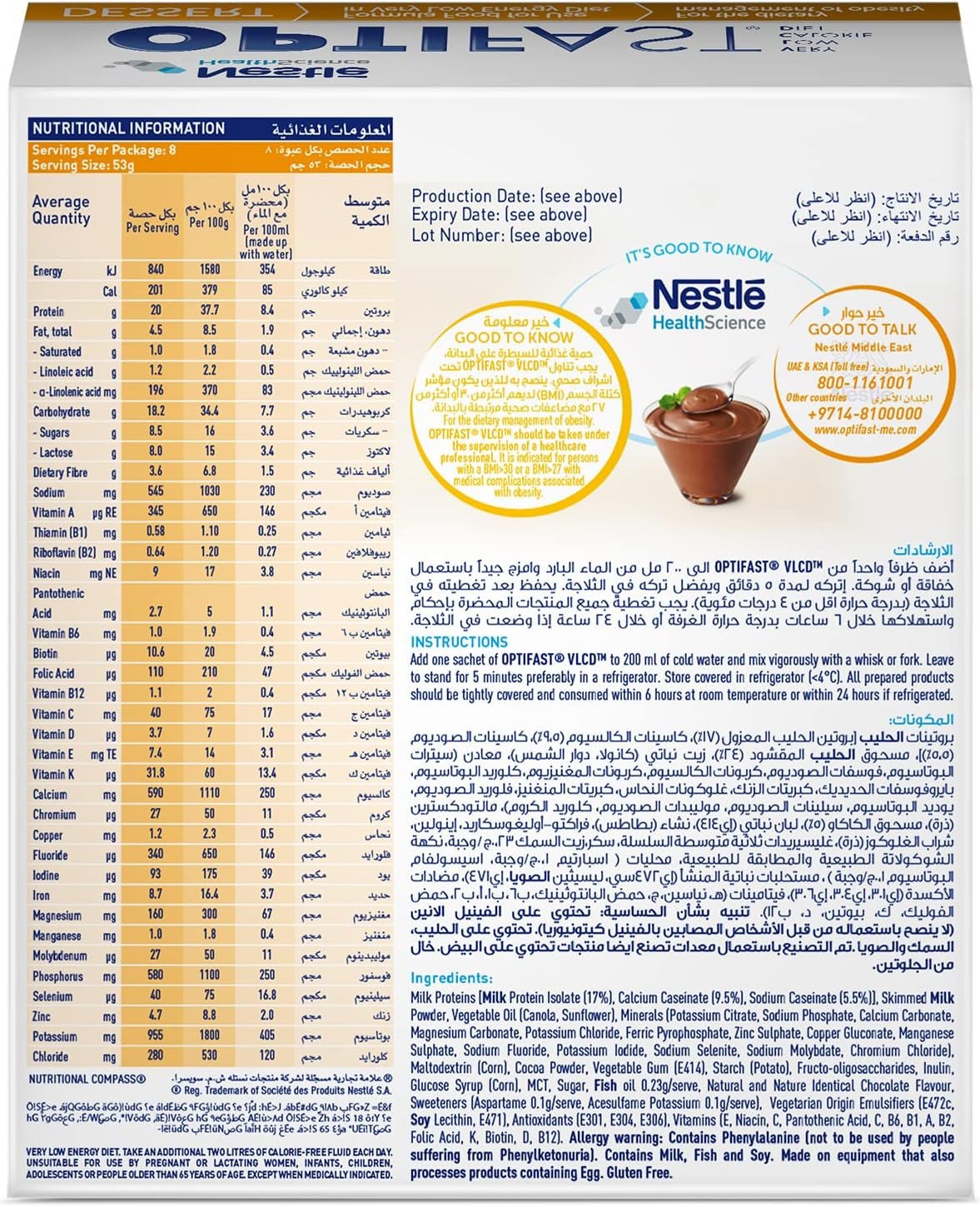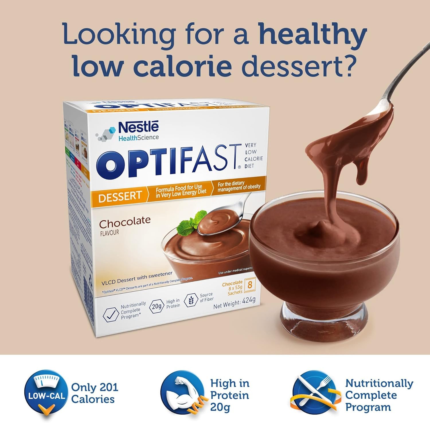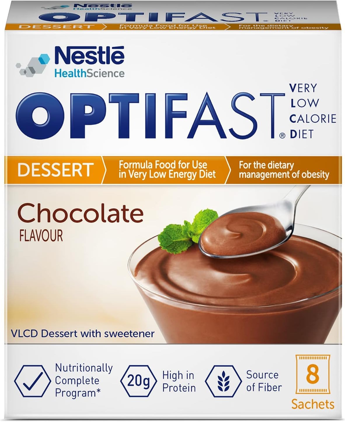 A powdered dessert mix formulated as a nutritionally complete Very Low Calorie Diet (VLCD) meal replacement with a chocolate flavor. Features: 20g Protein. Low in Calories (approx. 200 kcal). Simple to prepare by mixing with cold water. Key Ingredients: Skimmed Milk Powder, Milk Proteins (Caseinate), Fructose, Cocoa Powder, Vegetable Oils, Inulin, Minerals and Vitamins (VLCD full blend), Starch, Flavouring, Sweetener.Optifast is a specialized brand of Very Low Calorie Diet (VLCD) products (shakes, bars, soups, desserts) owned by Nestlé Health Science. The program and products are nutritionally complete but very low in energy, designed for rapid weight loss and must be used under medical supervision.Add 1 sachet (53g) to 200mL of cold water. Mix vigorously with a whisk/fork or shaker. Leave to stand for 5 minutes (preferably refrigerated). Use within 24 hours.Vlcd Warning: Use Under Medical Supervision. Not Suitable For Pregnant/Lactating Women, Infants, Children, Or Adolescents (Unless Medically Advised). Ensure Minimum 2L Of Calorie-Free Fluid Daily. Allergens: Milk, Soy.
