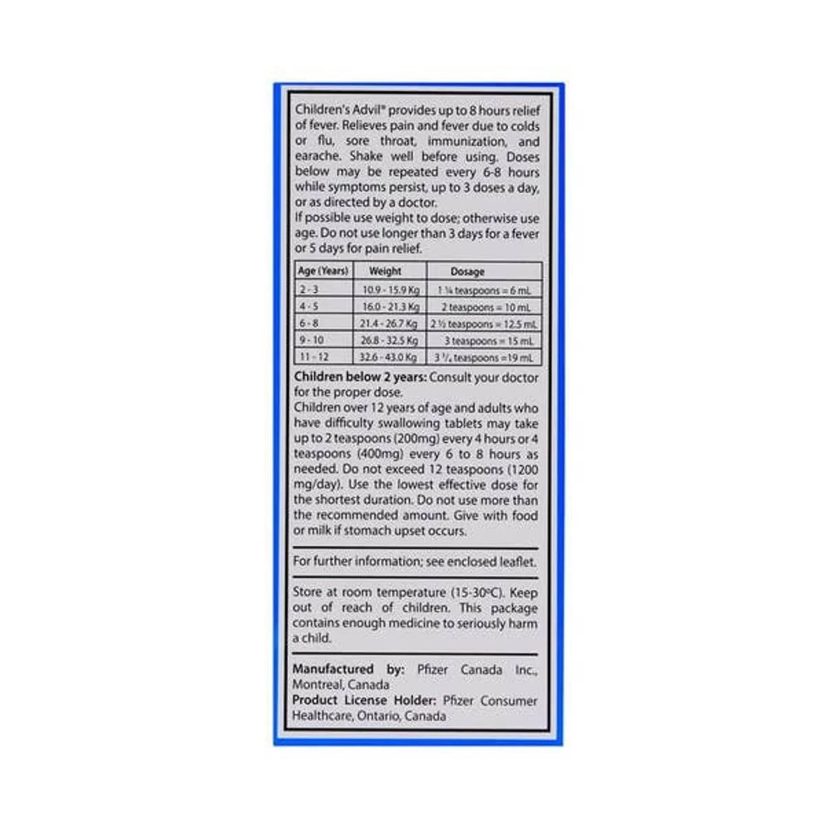 Advil Children Suspension Bubblegum Flavour is an ibuprofen oral suspension designed for children ages 2-11. It provides up to 8 hours of relief from fever and minor aches and pains. The bubblegum flavor makes it easy for children to take. Alcohol-free and suitable for various common ailments like colds, flu, and sore throats. Key Features Relieves pain and fever due to colds or flu Lasts up to 8 hours Suitable for ages 2-11 years Bubble gum flavor Alcohol-free formulation Ibuprofen (NSAID) (100 mg), Carboxymethylcellulose Sodium, Citric Acid, Monohydrate, Edetate Disodium, FD&C Red No. 40, Glycerin, Microcrystalline Cellulose, Natural and Artificial Flavor, Polysorbate 80, Propylene Glycol, Purified Water, Sodium Benzoate, Sorbitol Solution, Sucrose, Xanthan Gum.Advil: Trusted for effective pain relief and fever reduction.Shake well before using. Doses may be repeated every 6-8 hours while symptoms persist, up to 3 doses a day, or as directed by a doctor.Keep out of reach of children. This package contains enough medicine to seriously harm a child.
