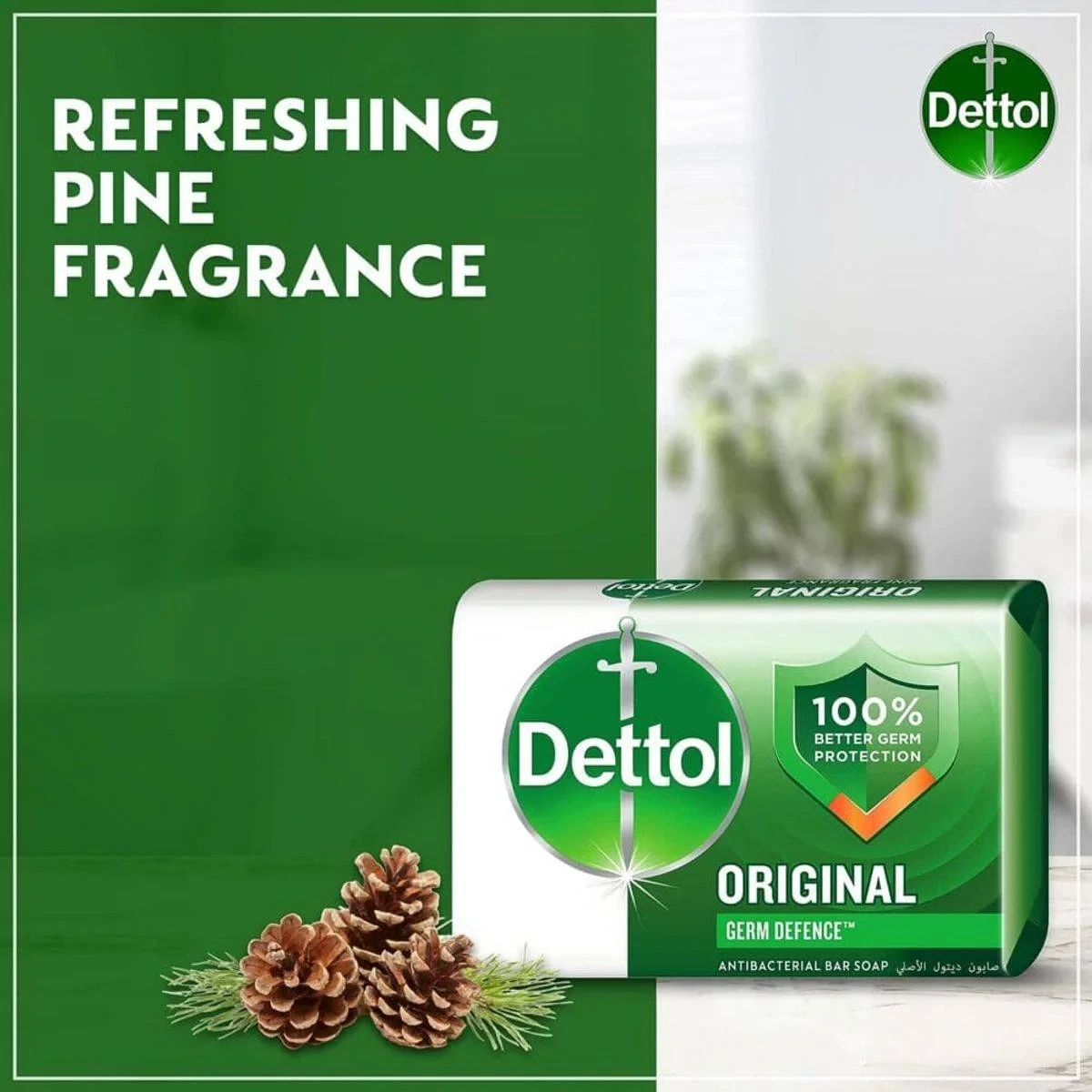 Dettol Antibacterial Bar Soap Original 165g offers 100% better germ protection with a refreshing pine fragrance. Dermatologically tested and free from TCC & Triclosan, it leaves your skin feeling healthy and fresh. Key Features 100% germ protection No TCC & Triclosan Dermatologically tested Pine fragrance Not SpecifiedDettol: Trusted for its antibacterial protection and hygiene solutions.Wet product with water, apply directly to the skin, lather, and rinse with water.For external use only, keep out of reach of children unless supervised, avoid contact with eyes, store in a cool and dry place.