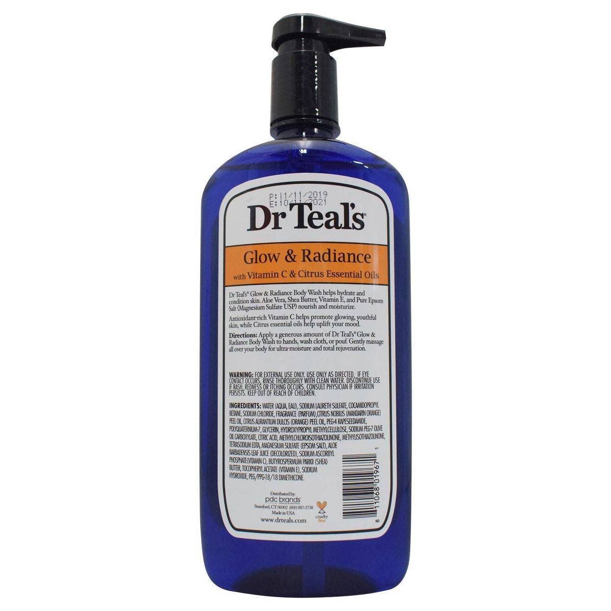 Dr Teal's Body Wash with Pure Epsom Salt Glow & Radiance hydrates and conditions skin with Aloe Vera, Shea Butter, and Vitamin E. Vitamin C promotes glowing skin, while citrus essential oils uplift mood. Ideal for daily use. Key Features