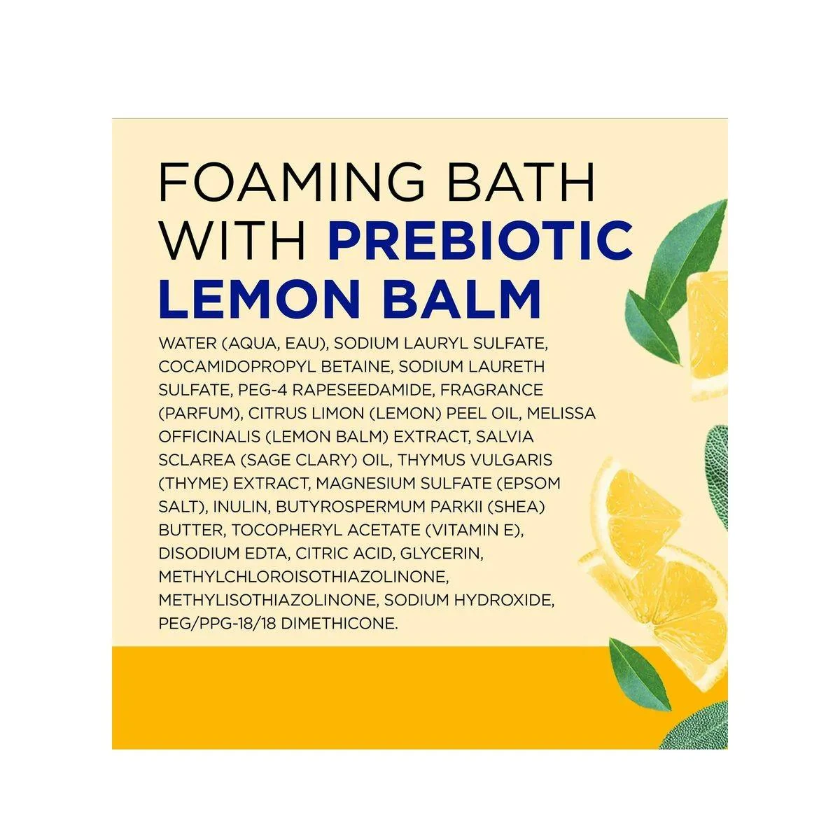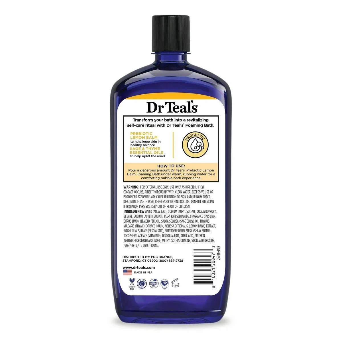 Dr Teal's Foaming Bath with Pure Epsom Salt and Prebiotic Lemon Balm offers a luxurious bath experience. Infused with essential oils, it helps uplift the mind and relax the muscles. Key Features Foamy texture for a luxurious bath Zesty lemon balm scent invigorates senses Epsom salt for muscle relaxation Microbiome-friendly prebiotic formula Essential oils uplift the mind Long-lasting bubbles gently cleanse Vegan, paraben-free, phthalate-free Water (Aqua, Eau), Sodium Lauryl Sulfate, Cocamidopropyl Betaine, Sodium Laureth Sulfate, PEG-4 Rapeseedamide, Fragrance (Parfum), Citrus Limon (Lemon) Peel Oil, Melissa Officinalis (Lemon Balm) Extract, Salvia Sclarea (Sage Clary) Oil, Thymus Vulgaris (Thyme) Extract, Magnesium Sulfate (Epsom Salt), Inulin, Butyrospermum Parkii (Shea) Butter, Tocopheryl Acetate (Vitamin E), Disodium EDTA, Citric Acid, Glycerin, Methylchloroisothiazolinone, Methylisothiazolinone, Sodium Hydroxide, PEG/PPG-18/18 Dimethicone.Dr Teal's specializes in wellness and relaxation products, known for their Epsom salt-based bath solutions.Pour a generous amount under warm, running water for a comforting bubble bath experience.For external use only. Use only as directed. If eye contact occurs, rinse thoroughly with clean water. Excessive use or prolonged exposure may cause irritation to skin and urinary tract. Discontinue use if rash, redness or itching occurs. Consult physician if irritation persists. Keep out of reach of children.