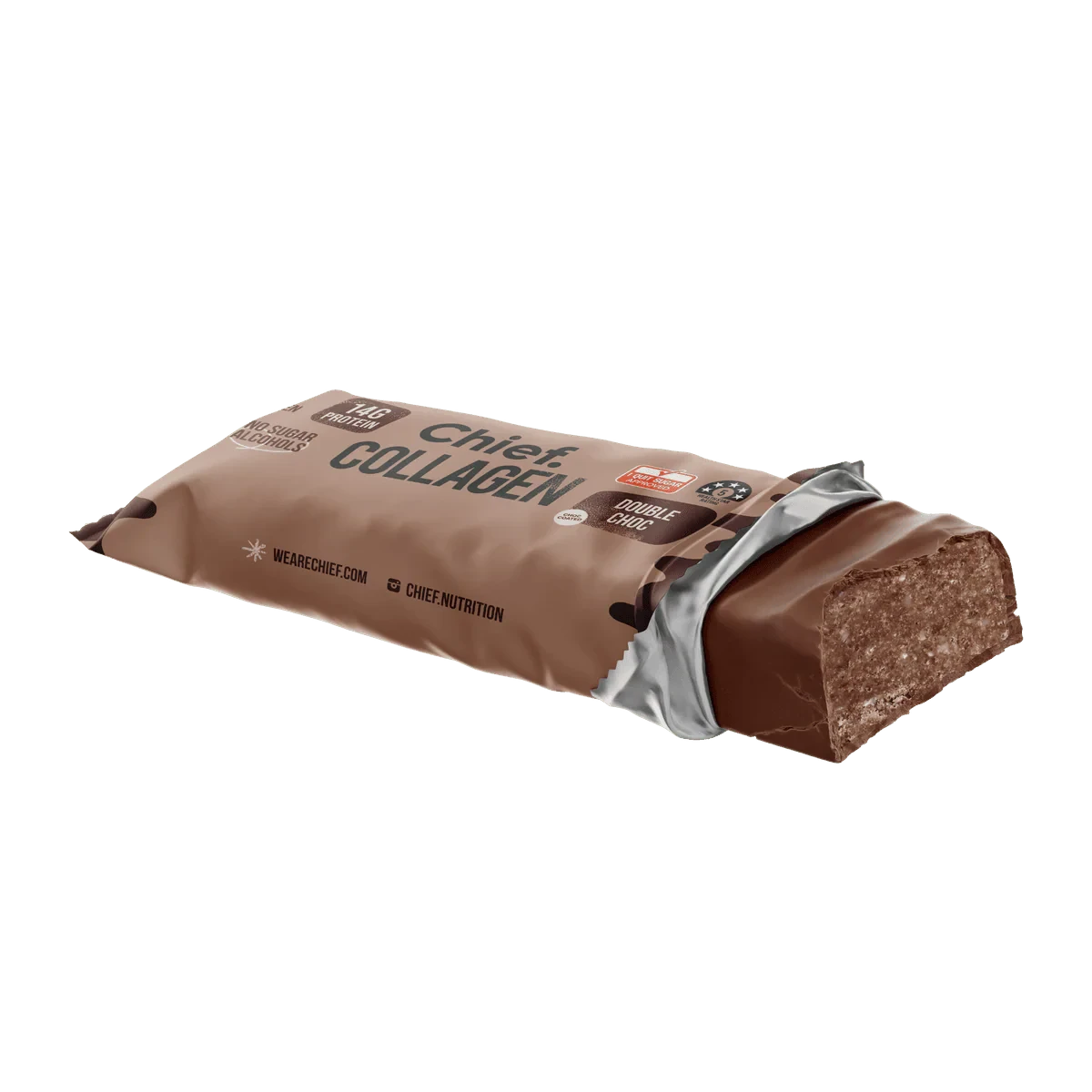 Chief Collagen Protein Bar Double Chocolate 45g is packed with protein, healthy fats, and fiber. It features a biscuity chocolatey cashew butter core and a luscious dark chocolate coating. Ideal for keto and paleo diets, it supports gut health and curbs cravings. Key Features Keto and Paleo friendly High in dairy-free protein No added sugar Gluten-free High in healthy fats Gut-friendly Preservative-free Egg-free Soy-free GMO-free Cashews [59%], Halal Grass Fed Bovine Collagen [18%], Tapioca Starch, Dark Chocolate (Cocoa Solids 70%, Sugar, Natural Flavour) [4%], Cocoa Powder [3%], Pure Maple Syrup, S.Officinarum Prebiotic Fibre, Vanilla Extract, Natural Chocolate Flavour, Organic Camu Camu Powder, Mct Oil Powder (Mct Oil Coconut, Acacia Fibre), Monk Fruit.Chief: Australian brand known for nutrient dense snacks without additives, using grass fed ingredients.Ready to eat. Consume pre or post workout or between meals as a protein source.Contains: Cashews. May Contain: Milk, Peanuts And Other Tree Nuts From The Processing Line.