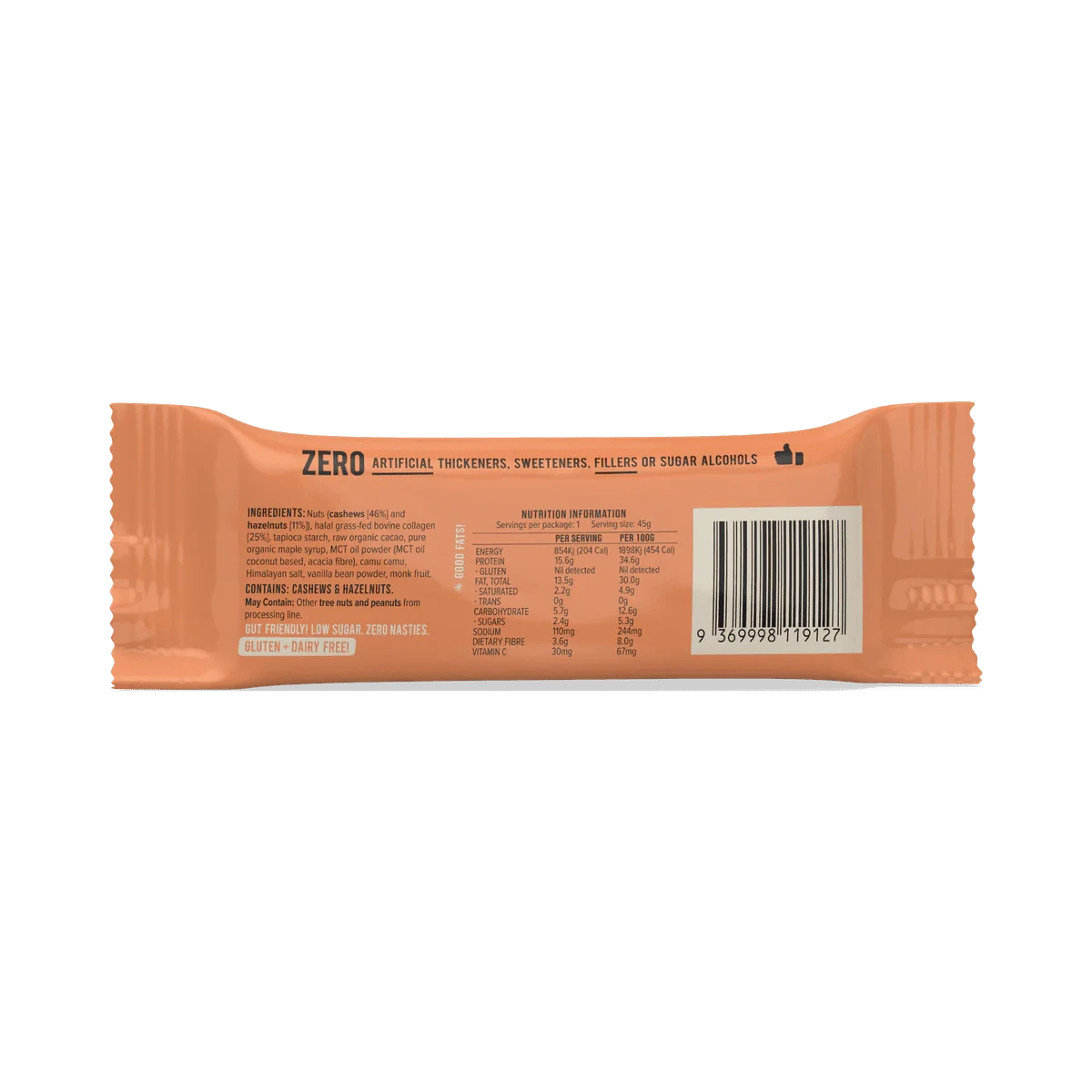 The Chief Collagen Protein Bar Hazelnut Brownie is a delicious, nutritious snack bar made with clean ingredients like cashews, hazelnuts, and collagen. It's perfect for those seeking a healthy, low-sugar option that supports gut health and muscle recovery. Enjoy it as a guilt-free treat or a protein boost in your daily routine. Key Features High in protein and healthy fats Low sugar, gluten-free Keto and Paleo friendly Gut health support Free from artificial sweeteners Supports muscle recovery Improves skin hydration Reduces joint pain Enhances skin elasticity Suitable for kids Nuts (Cashews [46%] And Hazelnuts [11%]), Halal Grass Fed Bovine Collagen [25%], Tapioca Starch, Raw Organic Cacao, Pure Organic Maple Syrup, Mct Oil Powder (Mct Oil, Acacia Fibre), Camu Camu, Himalayan Salt, Vanilla Bean Powder, Monk Fruit.Chief: Innovators in clean, nutritious snacks with a focus on gut health and natural ingredients.Enjoy as a snack anytime or add to smoothies for extra protein.Contains: Cashews & Hazelnuts. May Contain: Other Tree Nuts And Peanuts From Processing Line.