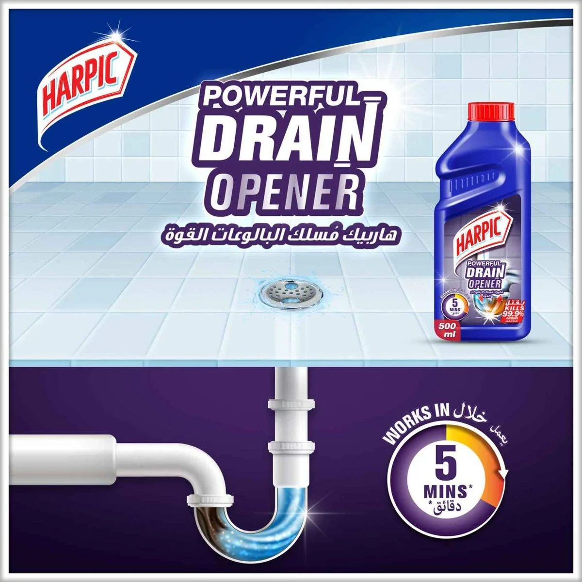 Harpic Powerful Drain Opener Cleaning Gel is designed to unclog drains quickly and efficiently. It works in just 5 minutes, killing 99.9% of germs, making it ideal for use in bathrooms and kitchens. Key Features Unclogs drains in minutes Kills 99.9% germs Effective for bathroom, shower, baths, basin, kitchen Powerful drain opener Sodium Hydroxide (Caustic Soda), Sodium Hypochlorite (Bleach), Non-ionic Surfactants, Water.Harpic is a global brand. This is a heavy-duty, corrosive cleaning gel designed to unblock clogged drains.Pour slowly the entire bottle (500ml) into the affected drain. Leave for 15-30 minutes. Flush thoroughly with hot water.DANGER: Highly corrosive. Causes severe skin burns and eye damage. Keep out of reach of children. Use protective gloves/eyewear.