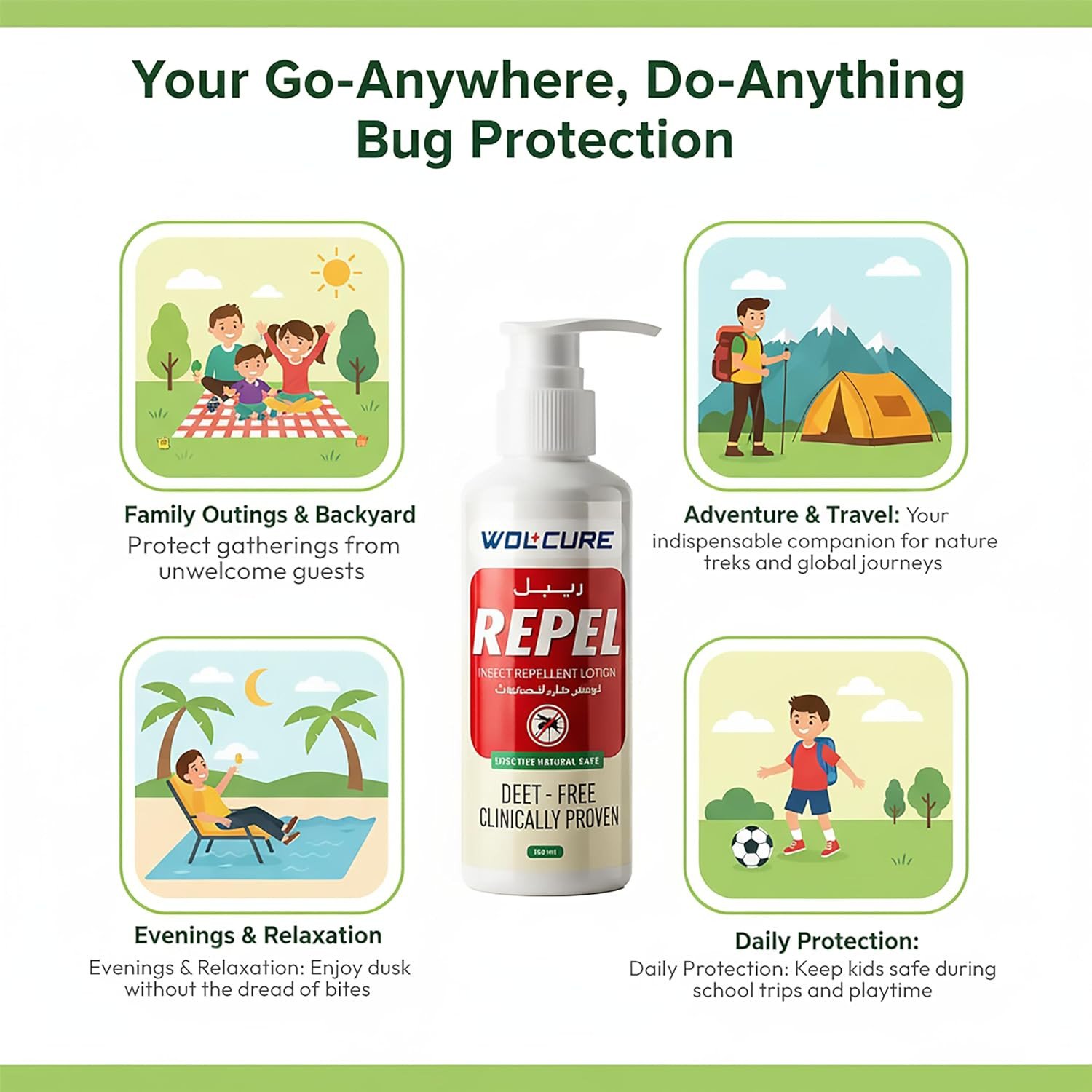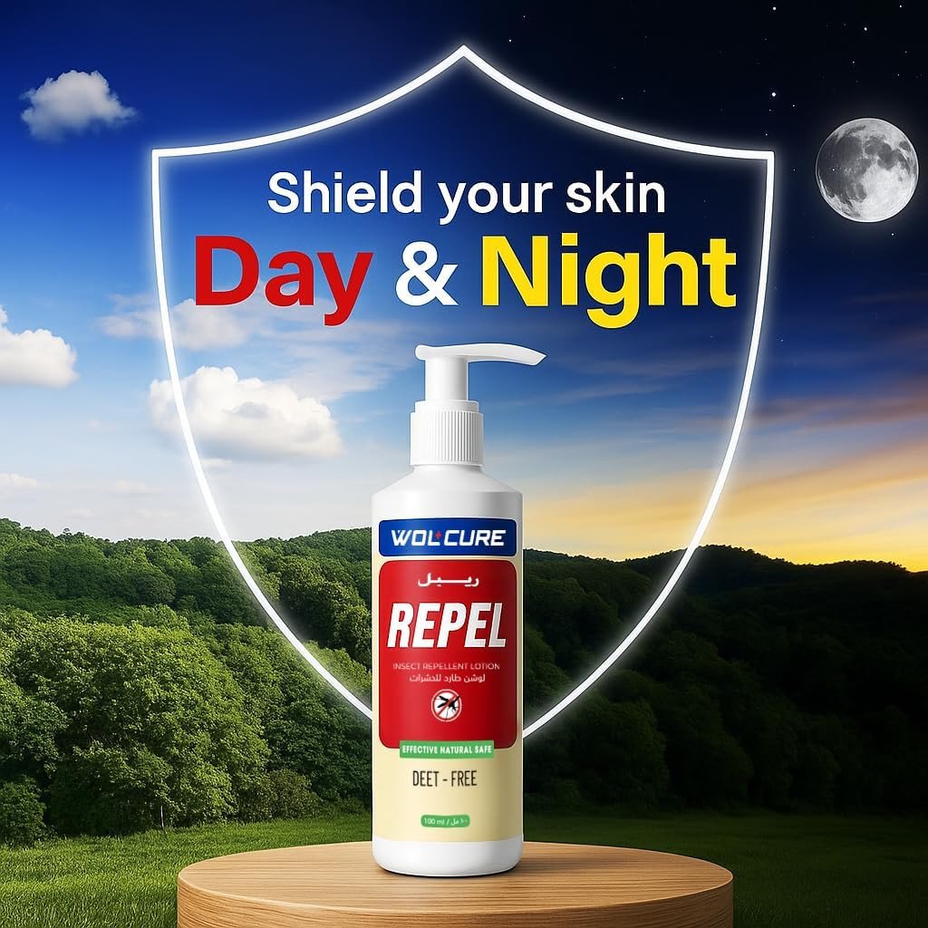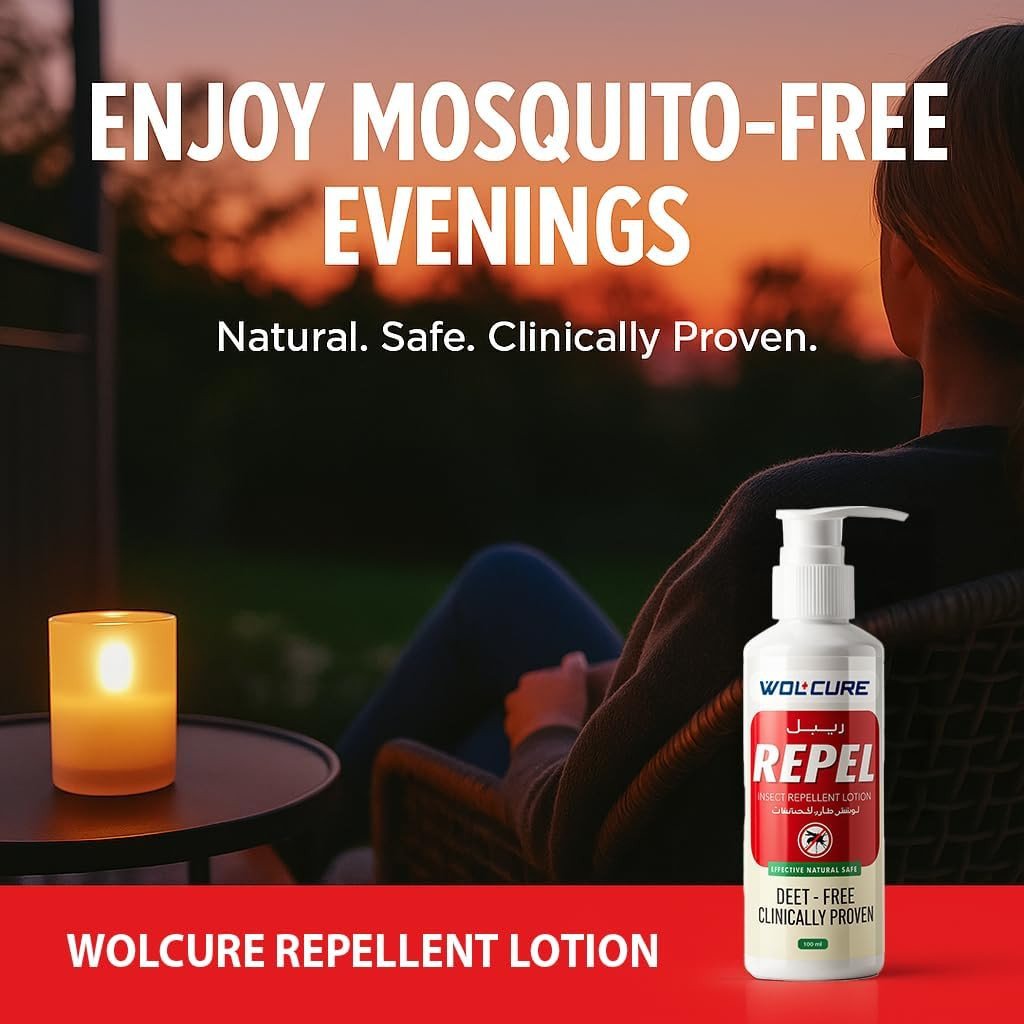 Wolcure Repel Insect Repellent Lotion is a DEET-free solution designed to provide effective protection against mosquitoes and other flying insects. Clinically proven to be safe and natural, this lotion is ideal for outdoor activities. Key Features DEET-free formulation Clinically proven effectiveness Natural and safe ingredients Repels mosquitoes and other flying insects Active Ingredient: DEET (Diethyltoluamide) or Picaridin (Icaridin) (Check label for exact active). Other: Water, Emollients (lotion base), Fragrance.Wolcure: Effective, natural, and safe insect repellent solutions.Apply evenly on exposed skin areas.For external use only. Keep out of eyes and mouth. Apply only to exposed skin. Wash hands thoroughly after use. Do not apply over cuts, wounds, or irritated skin.