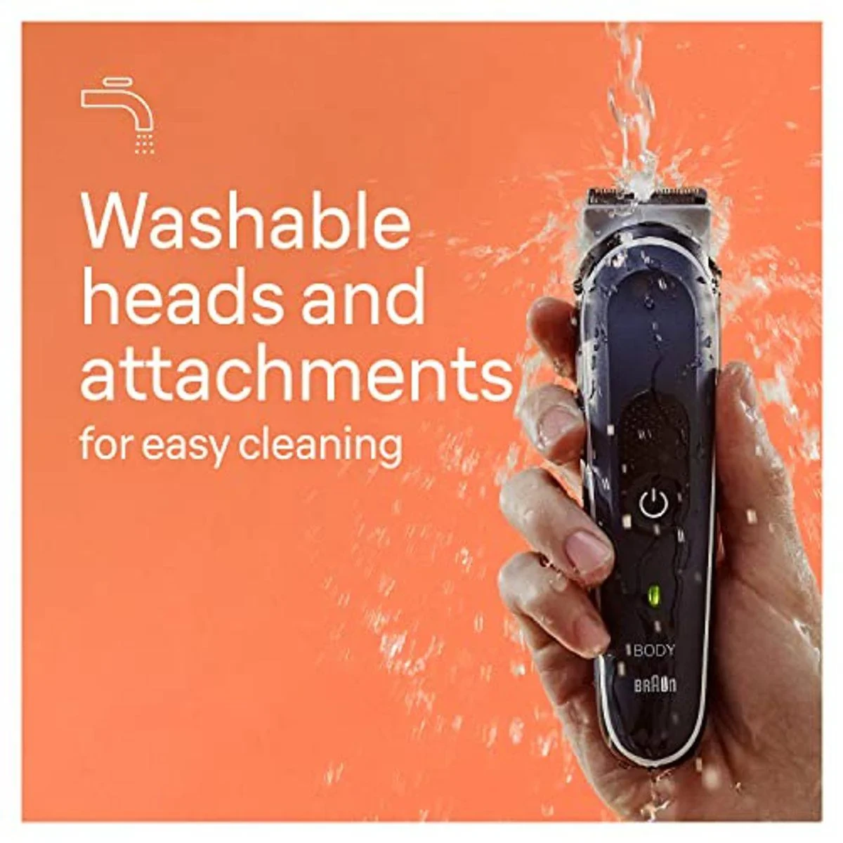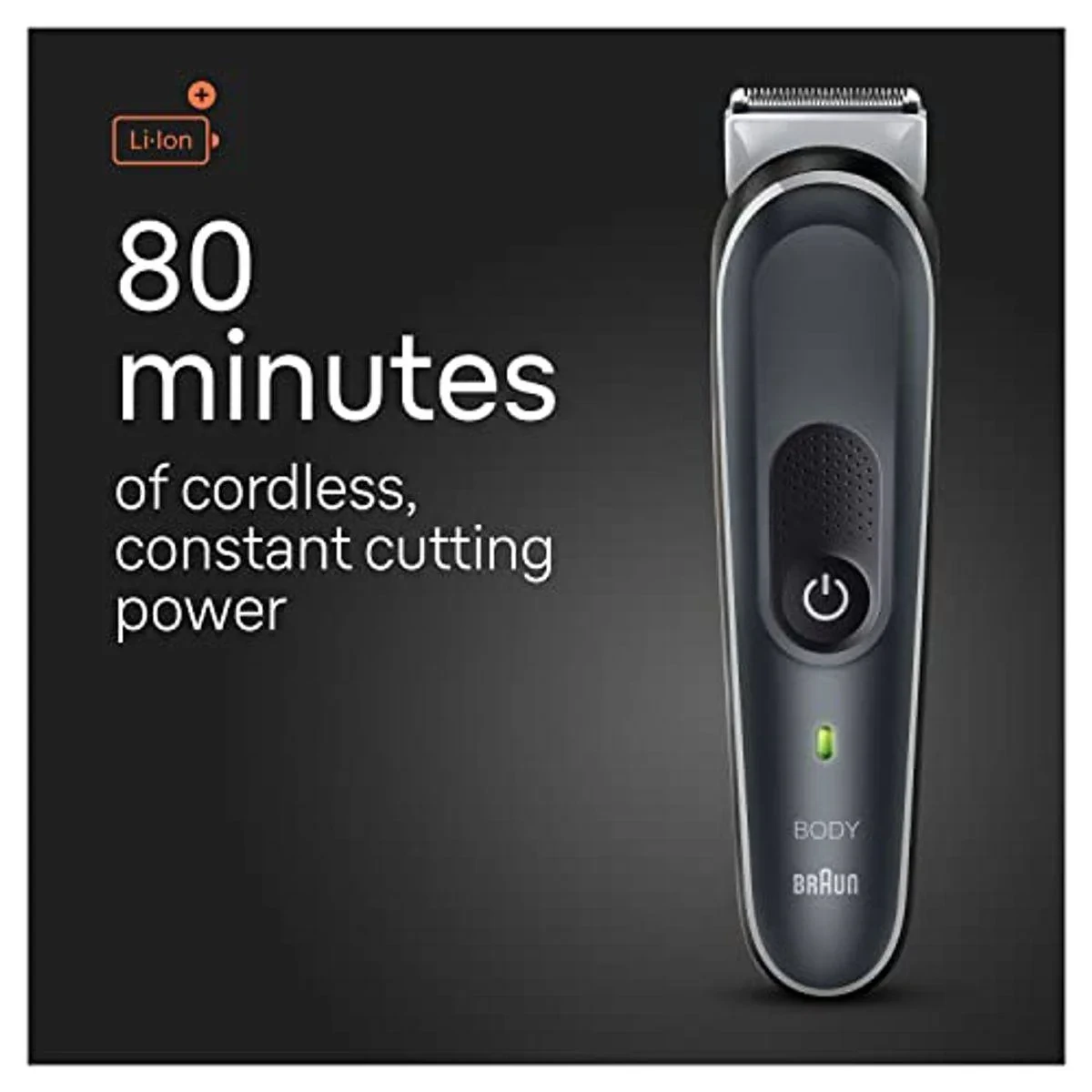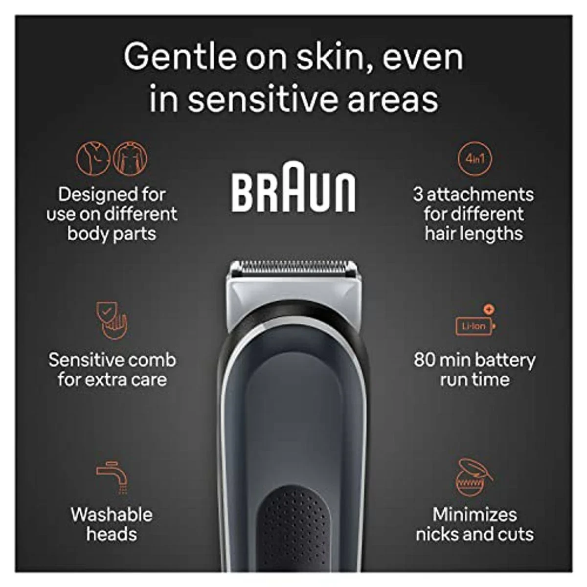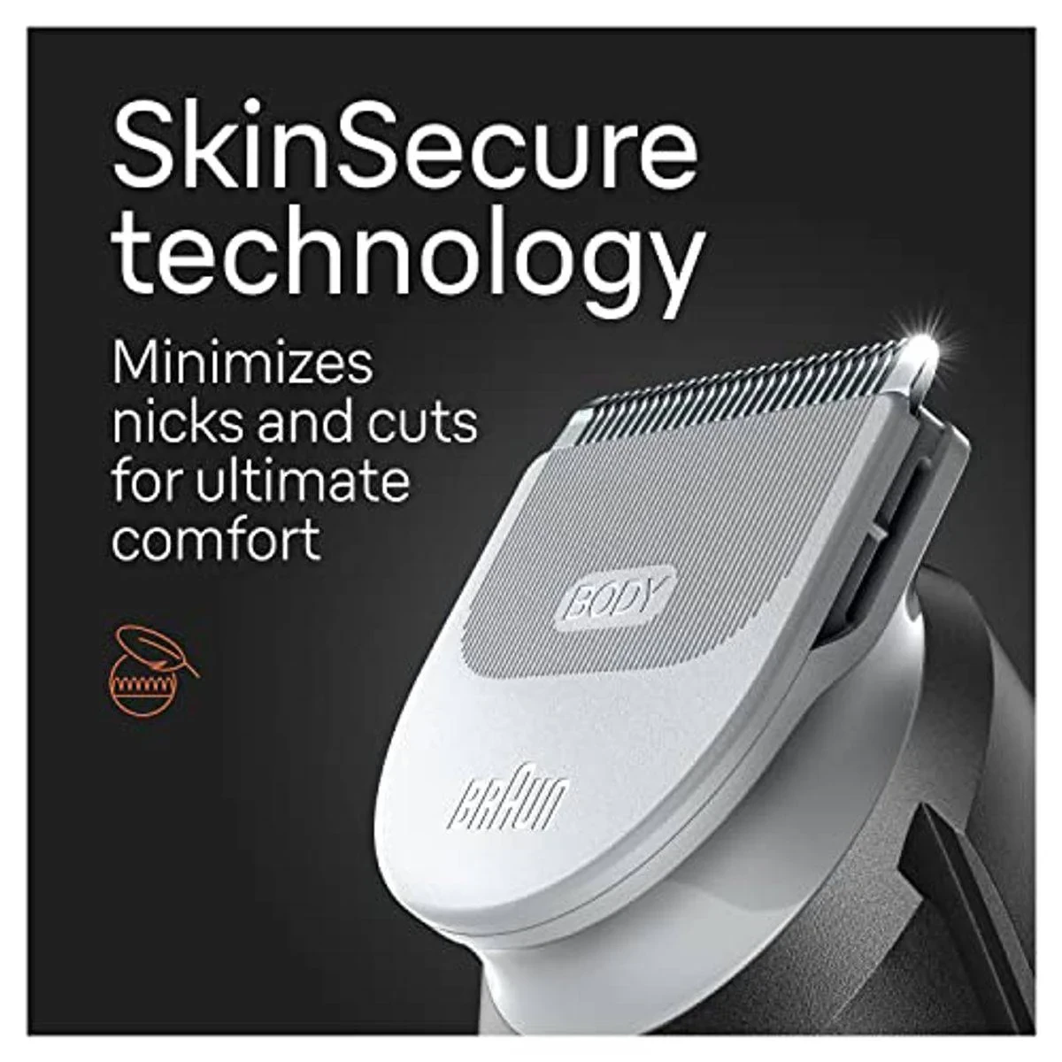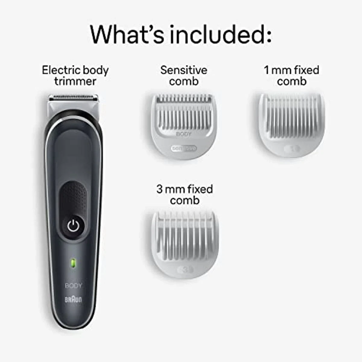 The Braun Body Groomer Series 3 BG3340 is designed for gentle full-body grooming, featuring SkinSecure technology to minimize nicks and cuts. It offers 80 minutes of cordless runtime and is fully washable for easy maintenance. Key Features SkinSecure technology Minimizes nicks and cuts 80 minutes cordless runtime Fully washable Extra grip handle LED charging indicator Gentle on skin Suitable for sensitive areas Key Materials: Plastic body; Metal blades; Battery.Renowned for innovative grooming solutions, Braun offers precision and comfort in personal care.Use The Appropriate Comb For Desired Hair Length And Trim With Slow, Even Movements.Electrical Warning: Keep charging unit away from water. Only use the charger supplied. Do not use if the cord or appliance is damaged.