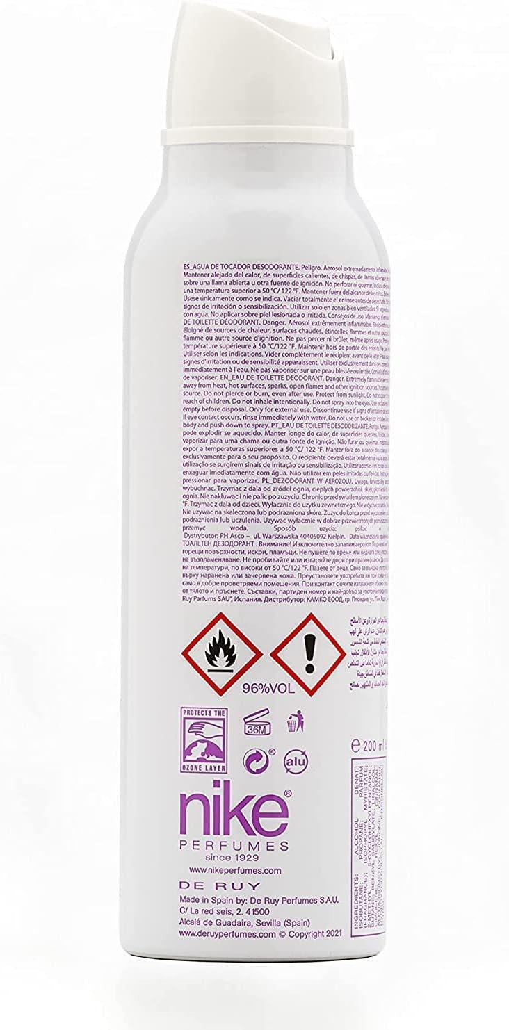 Isobutane, Fragrance, 2-Methyl Alcohol, Propane, Denat. Parfum, Isopropyl Myristate, 5-Cyclohexylpentanol, Butane, Benzyl Salicylate, Linalool, Limonene, Hexyl Cinnamal, Alpha-Isomethyl Ionone, Coumarin, Hydroxycitronellal, Citronellol, Citral.Nike Deodorant Spray Gourmand Street for Woman offers lasting freshness and confidence with its light, fast-absorbing formula. It effectively protects against unwanted odor and reduces perspiration, leaving an attractive, feminine scent. Ideal for the modern woman, this deodorant is perfect for daily use.Spray A Suitable Amount On Your Underarms After Showering And Drying Your Skin. Leave The Deodorant To Dry Before Getting Dressed. Can Be Used Daily Or As Needed.Do Not Spray On Irritated Skin Or Open Wounds.