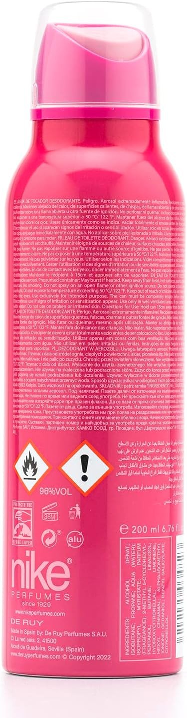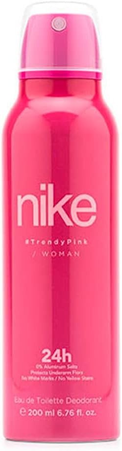 Alcohol Denat., Isobutane, Propane, Aqua (Water), Myristate, Parfum (Fragrance), 2-Methyl 5-Cyclohexyl-Pentanol, Butane, Linalool, Hydroxycitronellal, Limonene, Alpha-Isomethyl Ionone, Hexyl Cinnamal, Geraniol, Benzyl Salicylate.Nike Trendy Pink Woman Deodorant Spray combines the refreshing qualities of Eau de Toilette with effective odor protection. Its floral fruity fragrance opens with sparkling citrus and sweet fruity notes, transitioning into a heart of delicate florals. Perfect for daily wear, it ensures you stay fresh and confident all day.Clean And Dry The Armpits Before Use. Apply A Thin, Even Layer Of Deodorant To The Armpits. Allow The Deodorant To Dry Completely Before Putting On Clothes. Reapply If Necessary During The Day Or After Physical Activity.Avoid Contact With Eyes, Do Not Pierce Or Burn, Even After Use, Do Not Spray On An Open Flame Or Other Ignition Source, Extremely Flammable Aerosol, Highly Flammable, Pressurised Container: May Burst If Heated, Store Out Of Reach Of Children.