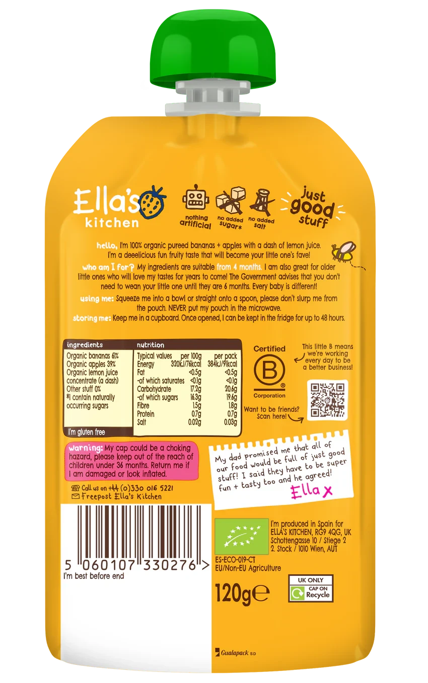 Ella's Kitchen Organic Puree is a 100% organic blend of bananas and apples, perfect for babies aged 4 months and up. With no added sugar or salt, this puree offers a smooth texture ideal for weaning. Convenient resealable pouch ensures freshness and easy feeding on-the-go. Key Features 100% organic fruits with no added sugar or salt Super smooth texture, perfect for weaning Convenient resealable pouch for on-the-go snacking Free from artificial flavors, colors, and preservatives Certified organic with eco-conscious packaging Organic Bananas 61%, Organic Apples 39%, Organic Lemon Juice Concentrate (a dash).Ella's Kitchen: Organic baby food brand known for nutritious purees with no added sugar or salt.Squeeze into a bowl or onto a spoon. Do not microwave. Stand pouch in hot water to warm.Warning: My cap could be a choking hazard, please keep out of the reach of children under 36 months.