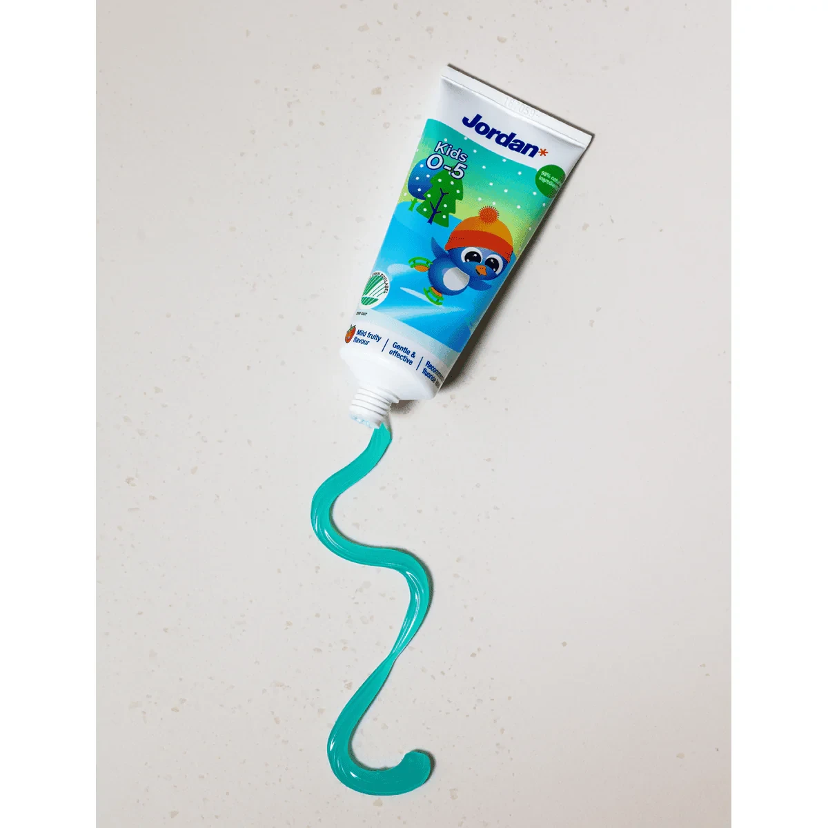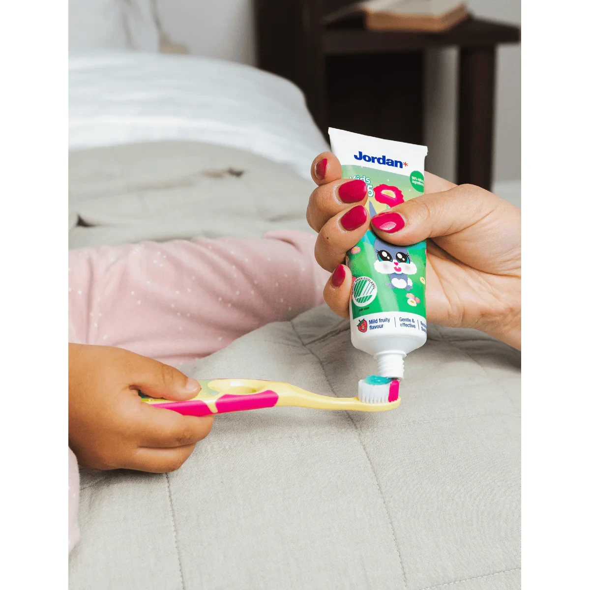 Jordan Kids Toothpaste is designed for children aged 0-5 years, offering gentle cleaning and cavity prevention. With 98% natural ingredients and a mild fruity flavor, it makes brushing fun and effective. Key Features Mild fruity flavor Gentle and effective cleaning Suitable for ages 0-5 Contains fluoride for cavity prevention SLS/Sulphate free Fun designs for kids Sodium Fluoride (500 ppm F-), Gentle Silica, 98% natural ingredients, Mild fruity flavor.Jordan: Trusted for gentle and effective oral care products for kids.Apply an appropriate amount onto a toothbrush. Brush teeth twice daily.Use under adult supervision.