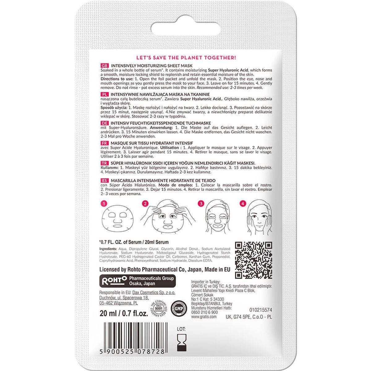 This moisturizing facial sheet mask is infused with Super Hyaluronic Acid to deliver intense hydration, smooth fine lines, and restore firmness. Suitable for all skin types, it is fragrance-free and designed for maximum absorption. Key Features