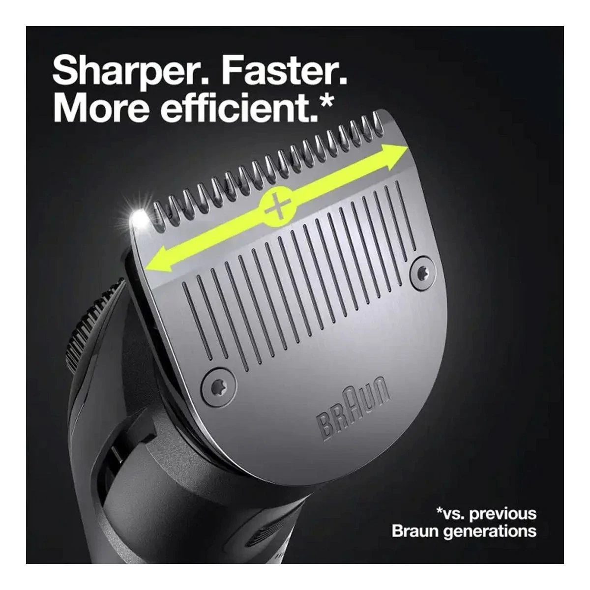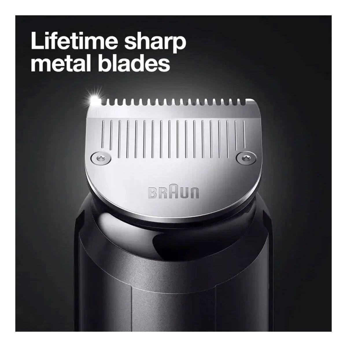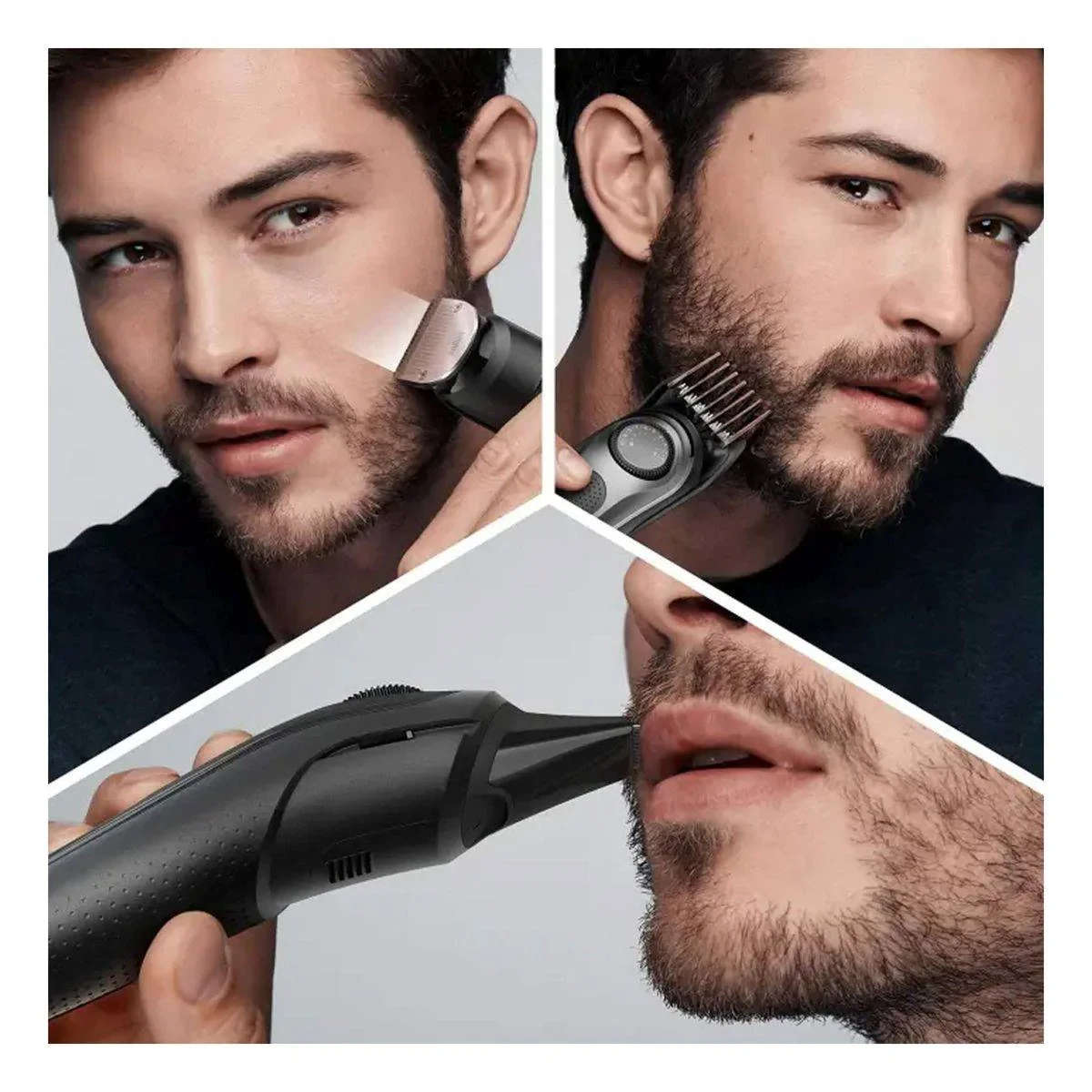 The Braun Beard Trimmer Series 7 offers precise grooming with a ProWheel for 40 length settings. Ideal for beard, body, and hair trimming with lifetime sharp blades and 100 minutes of cordless use. Key Features Lifetime sharp metal blades Precision wheel with 40 length settings 100 minutes of cordless run time 100% waterproof for wet or dry use AutoSense technology adapts to beard type Includes 12 tools in 1 kit LED charging and low battery indicator 5-minute quick charge for one trim Key Materials: Plastic body; AutoSense Metal Blade; Precision Dial (plastic); Rechargeable battery.Renowned for precision grooming tools and innovative technology.Use Wet Or Dry, Adjust Length With Prowheel.Electrical Warning: Keep charging unit away from water. Only use the charger supplied. Do not use if the cord or appliance is damaged.
