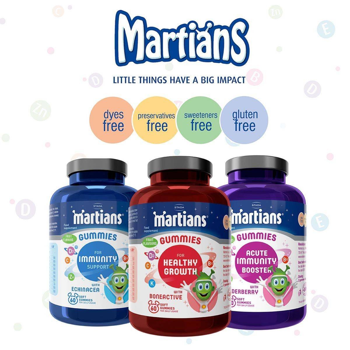 Glucose Syrup, Saccharose, Gelatin, Water, L Ascorbic Acid, Acidity Regulator: Citric Acid, Sambucus Nigra Extract, Zinc Citrate, D Alpha Tocopheryl Acetate, Nicotinamide, Blackcurrant Flavour, Concentrates: Black Carrot (In Blackcurrant Flavour), Spirulina And Safflower (Apple Flavour), Maltodextrin, Coconut Oil, Apple Flavour, Cyanocobalamin, Cholecalciferol, Phytomenadione, Glazing Agent: Carnauba Wax, Pteroylmonoglutamic Acid, D Biotin.Martians: Innovators in children's health supplements, known for their immunity boosting gummies.Take 2 gummies daily.Keep Out Of Sunlight. We Use Only Natural Dyes, Eventual Change Of Gelatin Color Does Not Affect Quality Of Preparation. Do Not Exceed The Stated Recommended Daily Dose. Food Supplements Should Not Be Used As A Substitute For A Varied Diet. Not Suitable For Children Under The Age Of 3. Store Out Of The Reach Of Children. Store In A Dark And Dry Place, At Temperature Below 25°C.