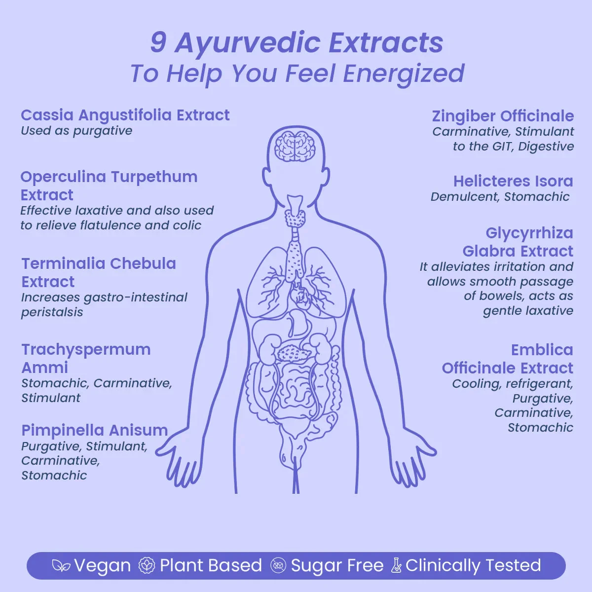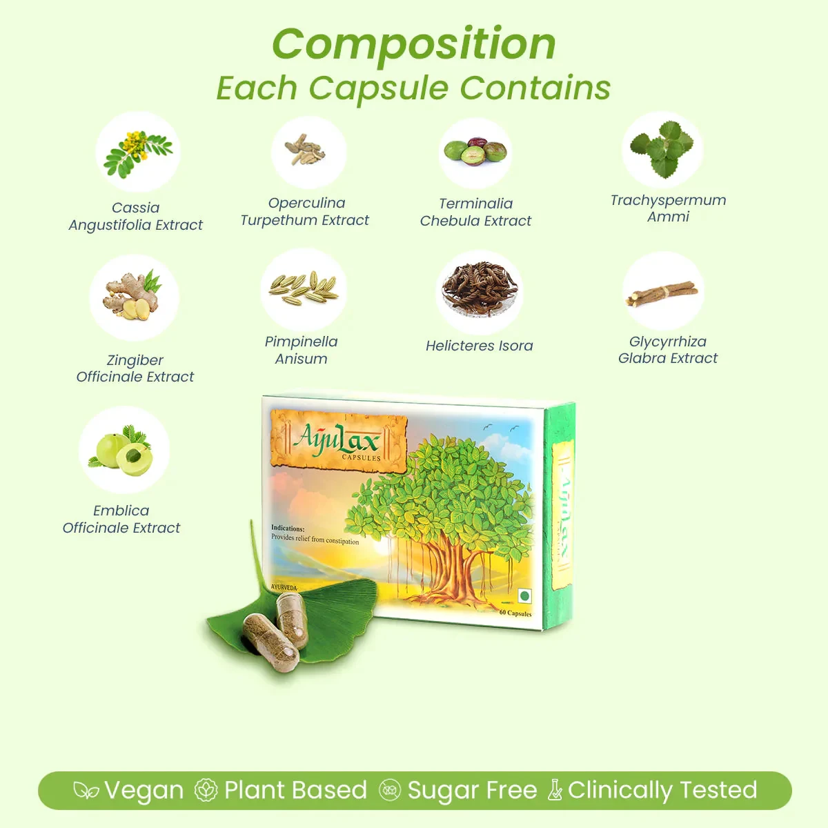 Ayulax Hard Gelatin Capsules are formulated with natural ingredients like Zingiber officinale and Pimpinella Anisum, known for their digestive benefits. This vegan, plant-based supplement is sugar-free and clinically tested to relieve constipation, flatulence, and colic, promoting healthy digestion and comfort. Key Features Ayurvedic herbal supplement Relieves constipation, flatulence, and colic Vegan and plant-based Sugar-free and clinically tested No side effects International quality standards Certified by The Sattvik Council of India ISO 9001:2008 certified Cassia Angustifolia Extract, Operculina Turpethum Extract, Terminalia Chebula Extract, Trachyspermum Ammi, Pimpinella Anisum, Zingiber Officinale, Helicteres Isora, Glycyrrhiza Glabra Extract, Emblica Officinale Extract.Ayulax: Pioneers in Ayurvedic herbal supplements, trusted globally for international quality standards.For Adults: Take 2 capsules two times daily, or as suggested by your healthcare provider. Do not exceed the daily recommended intake.Dietary Supplement: Consult a healthcare practitioner if pregnant/nursing, taking medication, or have a medical condition. Do not exceed recommended dose.