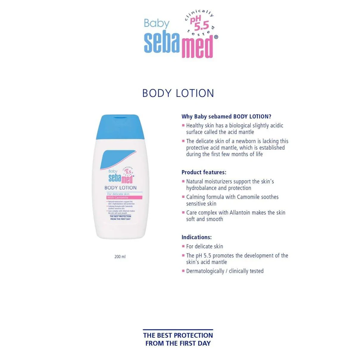 This baby lotion is designed for delicate skin, promoting the development of the skin's acid mantle with a pH of 5.5. It contains natural moisturizers to support the skin's hydrobalance and protection. The calming formula with chamomile soothes sensitive skin, while the care complex with allantoin makes the skin soft and smooth. Ideal for daily use. Key Features Natural moisturizers support skin's hydrobalance Calming formula with Camomile Soothes sensitive skin Care complex with Allantoin Natural Moisturizers, Camomile, Allantoin.Experts in baby care essentials and dermatologically tested products.Apply liberally to baby's skin after bathing or as needed. Gently massage until absorbed.For external use only. Avoid contact with eyes.