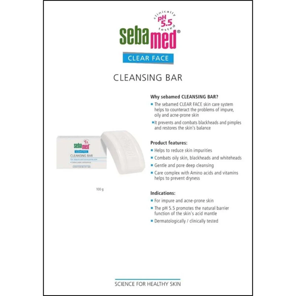 This soap-free cleansing bar is designed for acne-prone and sensitive skin. It gently cleanses without stripping the skin's natural protective layer. Enriched with vitamins and amino acids, it supports a healthy skin barrier and helps reduce pimples and blackheads. Ideal for daily use, it maintains the skin's pH balance at 5.5. Key FeaturesSoap-free facial cleanser Disodium Lauryl Sulfosuccinate, Stearic Acid, Cetearyl Alcohol, Sodium Cocoyl Isethionate, Sodium Lactate, Cocamidopropyl Betaine, Aqua, Parfum, Lecithin, Panthenol, Inositol, Glyceryl Stearate, Titanium Dioxide, Sodium Citrate, Sodium Chloride, Benzophenone-4, Sodium Benzoate, Phenoxyethanol, Benzyl Alcohol, Parfum.Dermatologist-developed skincare brand known for pH-balanced, soap-free products.Wet your face with lukewarm water before application. Create a lather by rubbing the cleansing bar between your hands. Gently massage the lather onto your face, focusing on congested or oil-prone areas. Avoid contact with the eyes. Rinse thoroughly with water, ensuring all residue is removed. Pat your face dry with a soft, clean towel. Use morning and evening for best results as part of your daily skincare routine.If irritation or dryness occurs, reduce usage frequency or consult a dermatologist. For external use only.