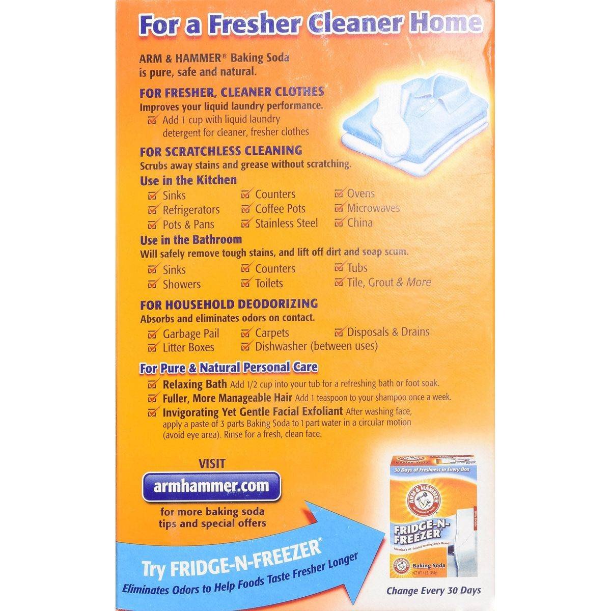 Arm & Hammer Pure Baking Soda is a versatile product used for cleaning, deodorizing, and personal care. Its natural formula is safe for use in the kitchen and bathroom, making it a household essential. Key Features America's #1 trusted baking soda brand Pure, safe, and natural Countless uses: cleaning, laundry, deodorizing Improves laundry performance Scratchless cleaning for various surfaces Absorbs and eliminates odors Suitable for personal care uses Key Ingredient: Sodium Bicarbonate (NaHCO3?). (Pure compound).America's #1 trusted baking soda brand, known for its purity and versatility in cleaning and deodorizing.Add 1 Cup With Liquid Laundry Detergent For Cleaner, Fresher Clothes.Food/Household: Not intended for medical use unless specified. Keep out of reach of children.