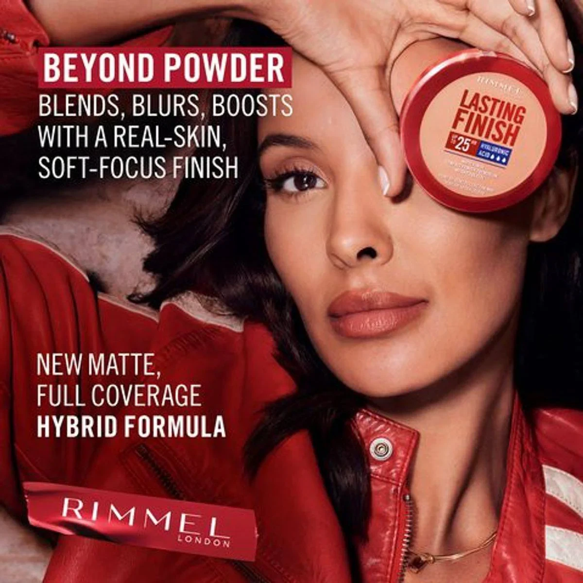 Rimmel Lasting Finish Matte Compact Foundation offers a matte finish with full coverage. It blends seamlessly with skin, providing a soft-focus finish and long-lasting wear. Ideal for controlling shine and perfecting skin tone. Key Features Matte finish Full coverage Hybrid formula Long-lasting wear Oil control Vegan formula SPF20 protection Contains Hyaluronic Acid Anti-pollution shield Transfer-resistant Mica, Talc, Dimethicone, Titanium Dioxide [Nano], Ethylhexyl Methoxycinnamate, Methicone, Methyl Methacrylate Crosspolymer, Caprylyl Glycol, Phenoxyethanol, Alumina, Sodium Dehydroacetate, Hydrogen Dimethicone, Bht, Aqua/Water/Eau, [May Contain/Peut Contenir/+/-:Iron Oxides (Ci 77491, Ci 77492, Ci 77499), Titanium Dioxide (Ci 77891)].Rimmel London: Iconic beauty brand known for innovative makeup products.Use The Included Mirror And Foundation Sponge To Apply The Makeup Powder To Your Face.For external use only. Discontinue use if irritation occurs. Avoid inhalation of powder dust.