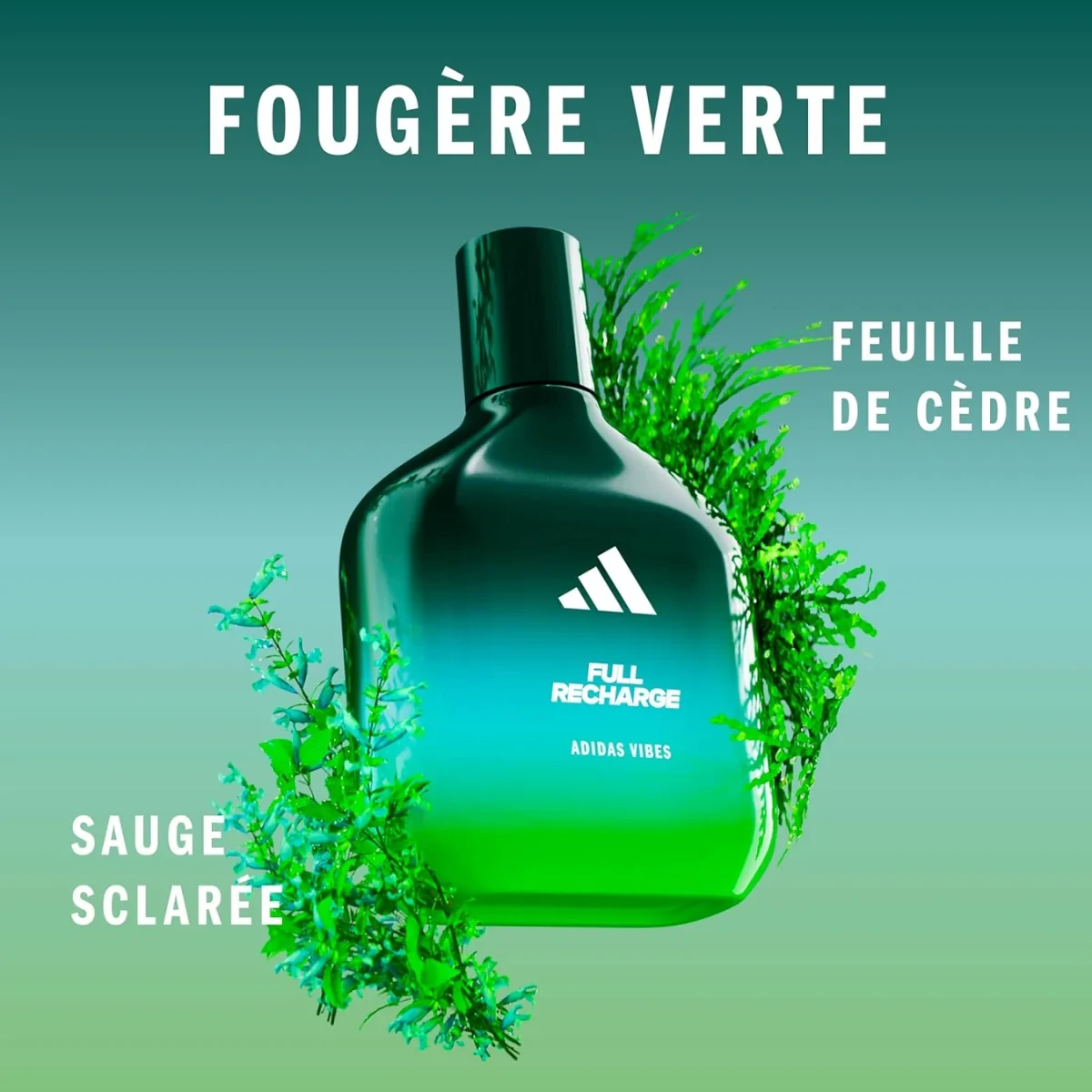 FEEL THE VIBE* thanks to the new Adidas fragrances. Vibes Full Recharge Eau de Parfum has been proven to awaken a good mood. Its fresh and invigorating notes of Cedar Leaf and Sage transport you to a weekend of escape in nature. a-unordered-list a-vertical a-spacing-mini