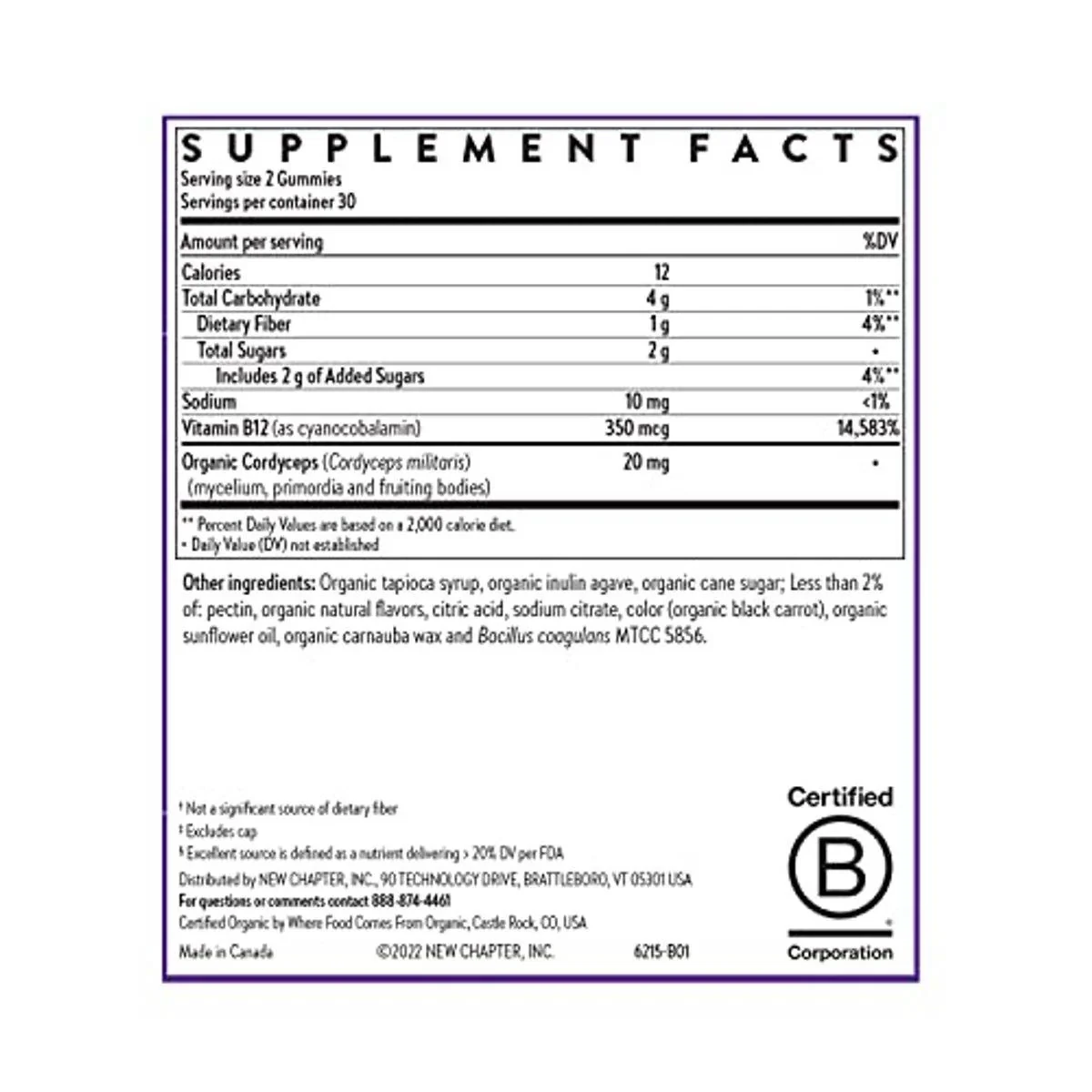 New Chapter Cellular Energy Vitamin B12+ Gummies are crafted to help your body convert food into fuel for cellular energy. Enhanced with organic Cordyceps mushroom, these gummies provide an excellent source of B12, delivering 14,583% Daily Value per serving. Made with organic Blue Agave Fiber, they contain 47% less sugar than most gummies and are 100% vegan and gluten-free. Key Features Supports cellular energy Enhanced with organic Cordyceps mushroom Made with organic Blue Agave Fiber Non-GMO Project Verified USDA certified organic 100% vegan & gluten-free Raspberry flavored Bottle made with 99% post-consumer recycled material Organic tapioca syrup, organic inulin agave, organic cane sugar, less than 2% of: pectin, organic natural flavors, citric acid, sodium citrate, color (organic black carrot), organic sunflower oil, organic carnauba wax, Bacillus coagulans MTCC 5856.New Chapter: Experts in organic vitamins and supplements for cellular energy and wellness.Adults, chew two gummies daily. Can be taken anytime, even on an empty stomach.Consult your healthcare professional prior to using this product if you are taking medication or have a serious medical condition. If nursing, pregnant, or considering pregnancy, consult your healthcare professional prior to using this product. Discontinue use and contact a healthcare professional if you experience an allergic reaction or side effect. Avoid use if known sensitivity to any of the ingredients. Do not exceed suggested use. Keep out of reach of children.