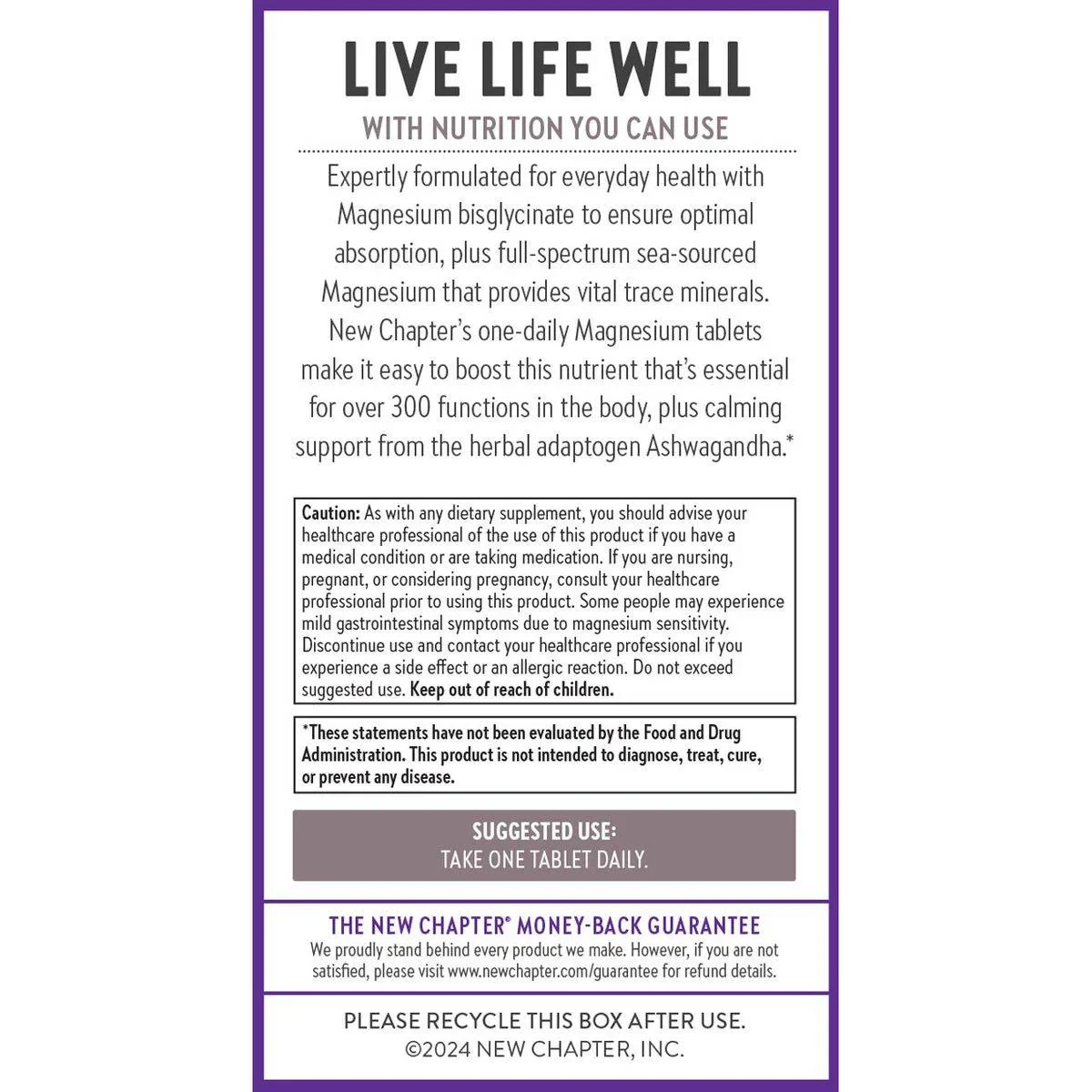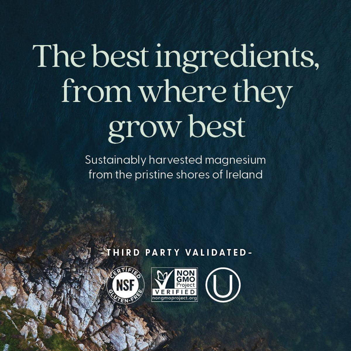 Magnesium (325 mg from seawater and TRAACS® magnesium bisglycinate chelate buffered from magnesium bisglycinate chelate and magnesium oxide), Organic Ashwagandha (Withania somnifera) 25 mg (root and aerial parts) aqueous extract, Hydroxypropyl cellulose, Gum acacia, Maltodextrin; Less than 2% of: Magnesium stearate, Silica, Croscarmellose sodium, Hydroxypropyl methylcellulose, Stearic acid, Sodium acetate anhydrous.Innovative wellness brand specializing in herbal supplements and vitamins.Take one tablet daily.As with any dietary supplement, you should advise your healthcare professional of the use of this product if you have a medical condition or are taking medication. If you are nursing, pregnant, or considering pregnancy, consult your healthcare professional prior to using this product. Some people may experience mild gastrointestinal symptoms due to magnesium sensitivity. Discontinue use and contact your healthcare professional if you experience a side effect or an allergic reaction. Do not exceed suggested use. Keep out of reach of children.
