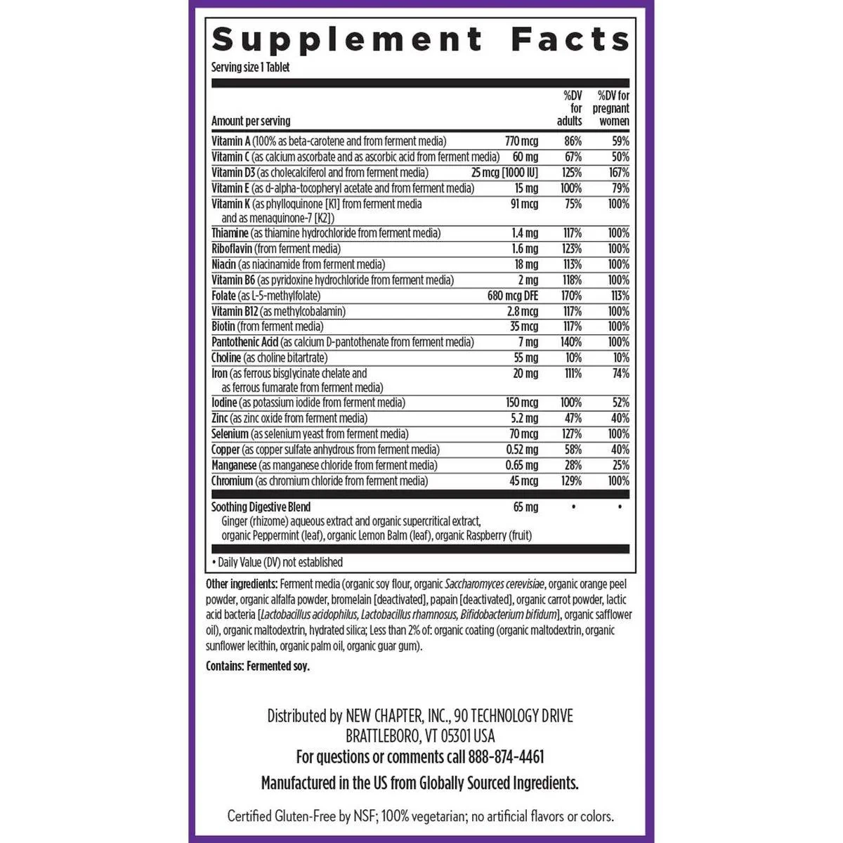 Vitamin C (Calcium ascorbate and ascorbic acid) 60 mg, Choline (Choline bitartrate) 55 mg, Iron (Iron [II] bisglycinate and Iron [II] fumarate) 27 mg, Vitamin B3 (Niacinamide) 18 mg, Vitamin E (D-a-tocopheryl acetate) [20.4 IU] 13.65 mg AT, Pantothenic acid (Calcium d-Pantothenate) 7 mg, Zinc (Zinc oxide) 5.2 mg, Vitamin B6 (Pyridoxine hydrochloride) 2 mg, Vitamin B2 (Riboflavin) 1.6 mg, Vitamin B1 (Thiamine) (Thiamine hydrochloride) 1.4 mg, Manganese (Manganese chloride) 0.65 mg, Copper (Copper [II] sulfate) 520 mcg, Folate (L-5 methyltetrahydrofolate) 400 mcg, Iodine (Potassium iodide) 150 mcg, Beta-carotene [77 IU] 128 mcg, Vitamin K1 (Phylloquinone) 90 mcg, Selenium (Selenium dioxide) 70 mcg, Chromium (Chromium [III] chloride) 45 mcg, Biotin 35 mcg, Vitamin D3 (Cholecalciferol) [1000 IU] 25 mcg, Vitamin B12 (Methylcobalamin) 2.8 mcg, Vitamin K2 (Menaquinone-7) 1 mcg, Ginger (Zingiber officinale) (rhizome) AqE 16:1 QCE 992 mg 62 mg, Organic Ginger (Zingiber officinale) (rhizome) SCE 19.75:1 QCE 19075 mg 1 mg, Organic Raspberry (Rubus idaeus) (whole fruit) 0.66 mg, Organic Lemon Balm (Melissa officinalis) (leaf) 0.66 mg, Organic Peppermint (Mentha x piperita) (leaf) 0.66 mg.New Chapter: Experts in prenatal vitamins, supporting mom and baby's health with fermented nutrients.Take 1 tablet daily with food.Consult a healthcare practitioner prior to use if you are taking blood thinners. Consult a healthcare practitioner prior to use if you have a history of non-melanoma skin cancer. Consult a healthcare practitioner if symptoms persist or worsen. Keep out of reach of children. There is enough drug in this package to harm a child. Known adverse reactions: Stop use if hypersensitivity occurs.