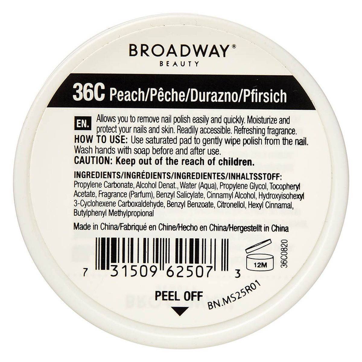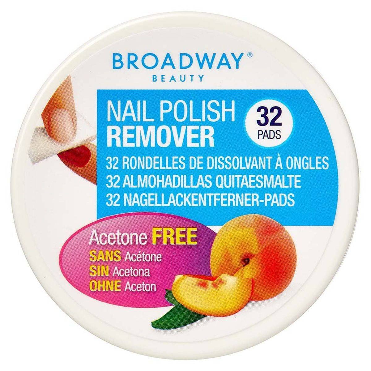 Kiss Broadway Beauty Nail Polish Remover Peach Pads offer acetone-free polish removal with moisturizing benefits. Ideal for quick and easy nail care. Features Acetone-free nail polish remover pads Quick and easy to use Moisturizes and protects nails and skin Refreshing peach fragrance Propylene Carbonate, Alcohol Denat., Water (Aqua), Propylene Glycol, Tocopheryl Acetate, Fragrance (Parfum), Benzyl Salicylate, Cinnamyl Alcohol, Hydroxyisohexyl 3-Cyclohexene Carboxaldehyde, Benzyl Benzoate, Citronellol, Hexyl Cinnamal, Butylphenyl Methylpropional.Innovative beauty solutions for nails and beyond.Use a saturated pad to gently wipe polish from the nail. Wash hands with soap before and after use.Keep out of the reach of children.