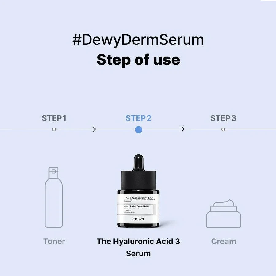 Highly concentrated 3% hyaluronic acid serum that hydrates, plumps, soothes and supports the skin's moisture barrier. It targets dry, dehydtarted, and flaky skin. Water, Butylene Glycol, Propanediol, Glycerin, Sodium Hyaluronate(3%), Pentylene Glycol, 1,2-Hexanediol, Diethoxyethyl Succinate, Sodium Polyacryloyldimethyl Taurate, Betaine, Xanthan Gum, Dimethicone, Hydroxyethyl Acrylate/Sodium Acryloyldimethyl Taurate Copolymer, Sodium PCA, Sodium Lactate, PCA, Glyceryl Acrylate/Acrylic Acid Copolymer, Hydrogenated Lecithin, Ethylhexylglycerin, Serine, Alanine, Glycine, Sodium Phytate, Sorbitan Isostearate, PVM/MA Copolymer, Glutamic Acid, Citric Acid, Lysine HCl, Threonine, Arginine, Sodium Methyl Stearoyl Taurate, Proline, Ceramide NP, Cholesterol, Caprylic/Capric Triglyceride, Phytosphingosine, Stearic Acid, Oleic Acid, Alcohol, Tocopherol, Lactic Acid, Caprylyl Glycol, Caprylhydroxamic AcidHighly concentrated 3% hyaluronic acid serum that hydrates, plumps, soothes and supports the skin's moisture barrier. It targets dry, dehydtarted, and flaky skin.After cleansing, during the serum phase, apply a few drops to the skin. Use fingertips to gently massage and absorb the serum, starting from the center of the face working towards the edges. * Can be used morning and/or evening.For external use only. Avoid contact with eyes. If the product gets into your eyes, rinse thoroughly with water. Discontinue use if a rash, redness, or itching occurs. Store in a cool, dry place away from direct sunlight.