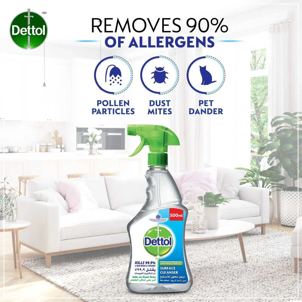 Dettol Antibacterial Surface Cleanser is designed to kill 99.9% of bacteria and viruses. It is safe for use on food preparation areas and leaves no harsh chemical residue. Ideal for maintaining a hygienic home environment. Key Features Kills 99.9% of bacteria and viruses Removes 90% of allergens Safe on food areas Antibacterial surface cleanser Suitable for use on food areas No harsh chemical residue Easy to use spray bottle Active Ingredient: Benzalkonium Chloride (Quaternary Ammonium Compound). Other ingredients: Water, Non-ionic Surfactants, Fragrance, Color.Dettol is a well-known global brand. This is a general-purpose surface cleaning spray with antibacterial properties.Turn nozzle to 'ON'. Spray directly onto the surface. Wipe clean with a cloth or sponge. No need to rinse.Caution: Causes serious eye irritation. Keep out of reach of children and pets. If in eyes, rinse cautiously with water for several minutes.