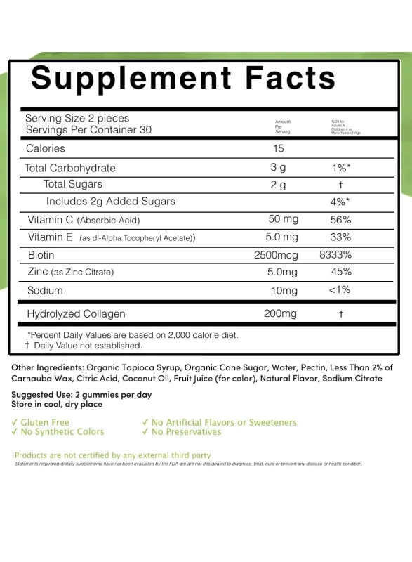 Organic Tapioca Syrup, Organic Cane Sugar, Water, Pectin, Less Than 2% Of Carnauba Wax, Citric Acid, Coconut Oil, Fruit Juice (For Color), Natural Flavor, Sodium Citrate, Hydrolyzed Collagen, Vitamin C (Ascorbic Acid), Vitamin E (As Dl-Alpha Tocopheryl Acetate), Biotin, Zinc (As Zinc Citrate), Sodium.Vitamina Beauty Multi + Collagen Gummies are designed to enhance skin, hair, and nail health. Infused with collagen, biotin, and vitamins C and E, these gummies support beauty from within. Ideal for daily use, they promote a radiant glow and stronger nails.Take 2 Gummies Daily, Preferably After MealsStatements Regarding Dietary Supplements Have Not Been Evaluated By The Fda And Are Not Designated To Diagnose, Treat, Cure, Or Prevent Any Disease Or Health Condition.