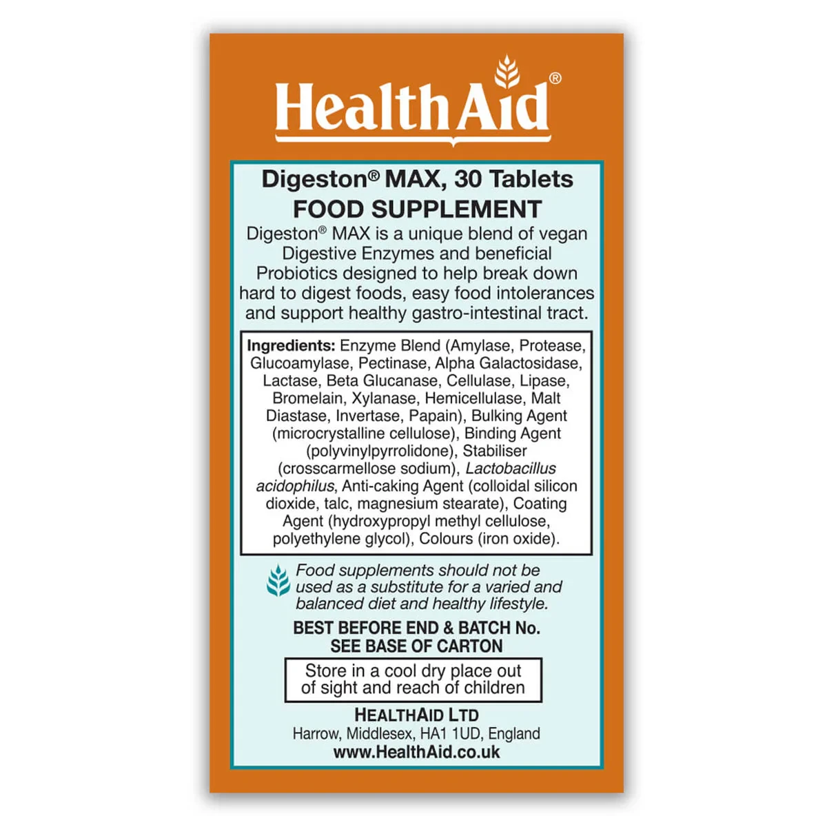 HealthAid Digeston Max is a unique blend of vegan digestive enzymes, including Amylase, Protease, and Lipase, essential for digesting carbohydrates, proteins, and fats. It contains Lactase to alleviate lactose intolerance symptoms and digestive issues. The formula includes Papain and Bromelain, pineapple and papaya extracts known for their anti-inflammatory and digestive properties. It is fortified with 7 Billion acid-resistant Probiotic Strains of Lactobacillus to replenish good bacteria, improve digestion, gut health, and support immune function. Digeston Max offers digestive comfort, intestinal balance, and optimal health with 15 potent vegan enzymes, fruit extracts, and probiotics in a one-a-day tablet. Key Features