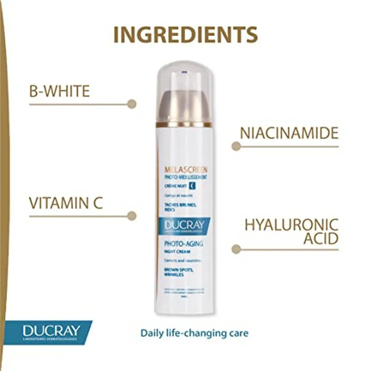 Water (Aqua), Dicaprylyl Carbonate, Isopropyl Palmitate, Isodecyl Neopentanoate, Glycol Palmitate, Ascorbyl Glucoside, Niacinamide, Glycerin, Arachidyl Alcohol, Dimethicone, Glyceryl Stearate, Peg 100 Stearate, Alcohol, Arachidyl Glucoside, Behenyl Alcohol, Benzoic Acid, Butylene Glycol, Caprylyl Glycol, Citric Acid, Disodium Edta, Fragrance (Parfum), Glycine Soja (Soybean) Oil, Hydrogenated Lecithin, Hydroxyethyl Acrylate/Sodium Acryloyldimethyl Taurate Copolymer, Oligopeptide 68, Polysorbate 60, Sodium Citrate, Sodium Hyaluronate, Sodium Hydroxide, Sodium Oleate, Sorbitan Isostearate, Squalane, Tocopherol, Tocopheryl Acetate, Viburnum Prunifolium Extract.Ducray: Dermatological expertise in skincare solutions for photo aging and pigmentation issues.Apply in the evening on face and neck, before going to bed.For External Use Only. Keep Out Of Reach Of Children.