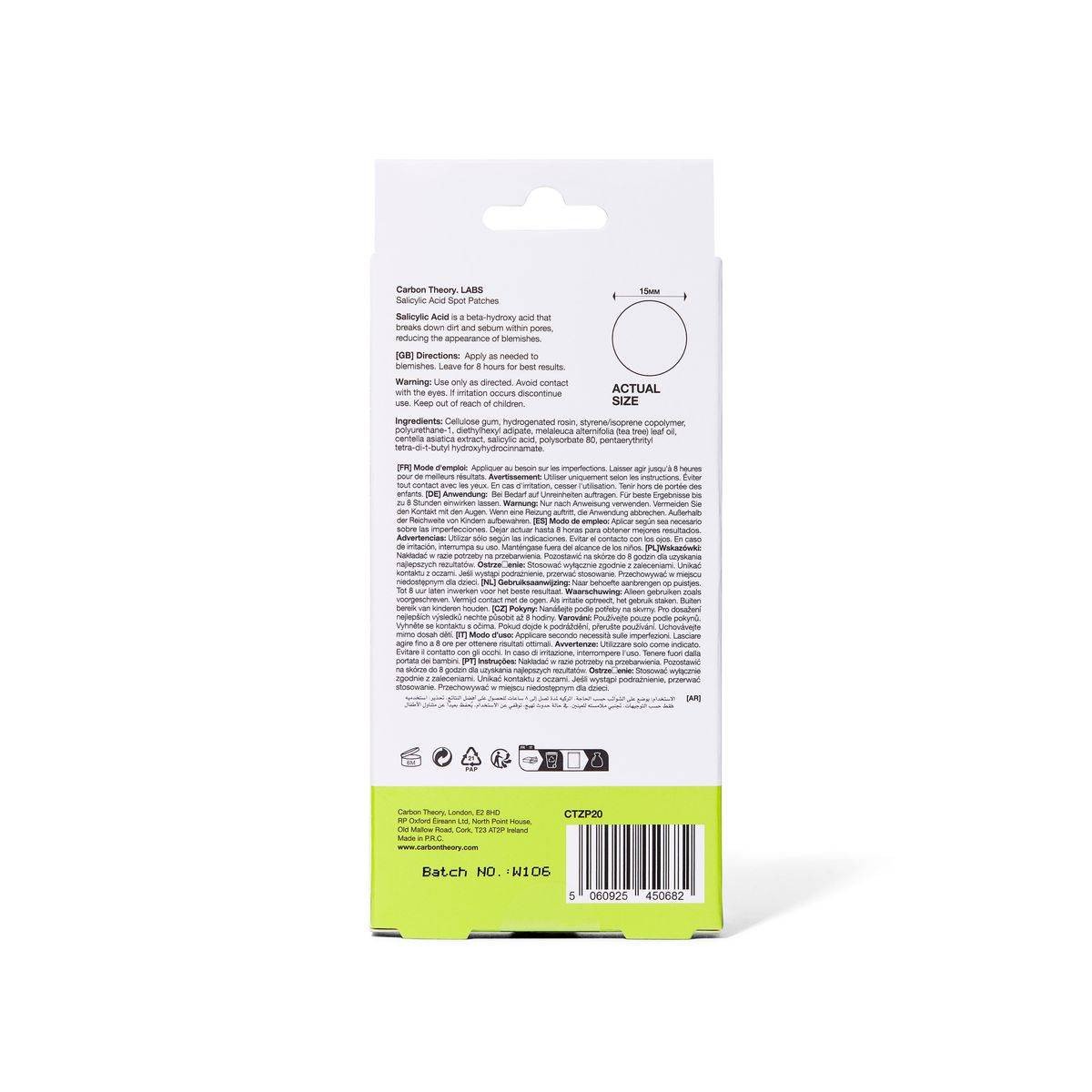 Carbon Theory Zap Supacylic Salicylic Acid Spot Patches are designed for fast-acting treatment of stubborn pimples. Infused with salicylic acid, these patches reduce inflammation and target blemishes effectively. Vegan and cruelty-free, they offer a convenient solution for clear skin. Key Features Fast-acting salicylic acid treatment Cellulose gum, hydrogenated rosin, styrene/isoprene copolymer, polyurethane-1, diethylhexyl adipate, melaleuca alternifolia (tea tree) leaf oil, centella asiatica extract, salicylic acid, polysorbate 80, pentaerythrityl tetra-di-t-butyl hydroxyhydrocinnamate.Carbon Theory: The Anti-Breakout Brand. Fast-acting, vegan & cruelty-free skincare solutions.Apply as needed to blemishes. Leave for 8 hours for best results.Use only as directed. Avoid contact with the eyes. If irritation occurs discontinue use. Keep out of reach of children.
