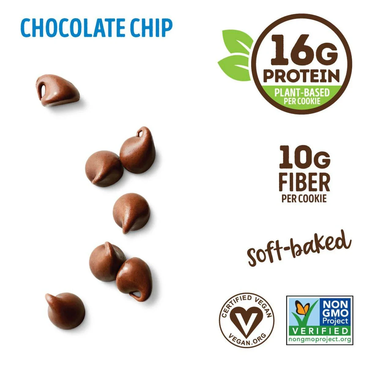 The Complete Cookie Chocolate Chip is a soft-baked, Certified Vegan cookie with 16g of plant-based protein and 10g of fiber per cookie. Non-GMO Project Verified and Kosher, it contains no high fructose corn syrup, artificial sweeteners, or sugar alcohols. Ideal for those seeking a delicious, protein-rich snack. Key Features 16g of plant-based protein per cookie 10g of fiber per cookie Certified Vegan Non-GMO Project Verified Soft-baked texture No high fructose corn syrup No artificial sweeteners No sugar alcohols Enriched Wheat Flour (Wheat Flour, Niacin, Reduced Iron, Thiamine Mononitrate, Riboflavin, Folic Acid), Protein Blend (Vital Wheat Gluten, Pea Protein, Rice Protein), Semi Sweet Chocolate Chips (Unsweetened Chocolate, Sugar, Cocoa Butter, Dextrose, Natural Vanilla Extract), Inulin, Cane Sugar, Invert Sugar, Vegetable Glycerine, Palm Fruit Oil, Sunflower Lecithin Or Canola Lecithin, Natural Flavor, Baking Soda, Salt, Xanthan Gum, Guar Gum.Lenny & Larry's specializes in plant based, protein packed snacks, known for their Complete Cookie range.Ready to eat. Open and consume as a protein/fiber snack.The Product Is Manufactured In A Facility That Processes Peanut, Tree Nut, Soy, Milk, And Egg.