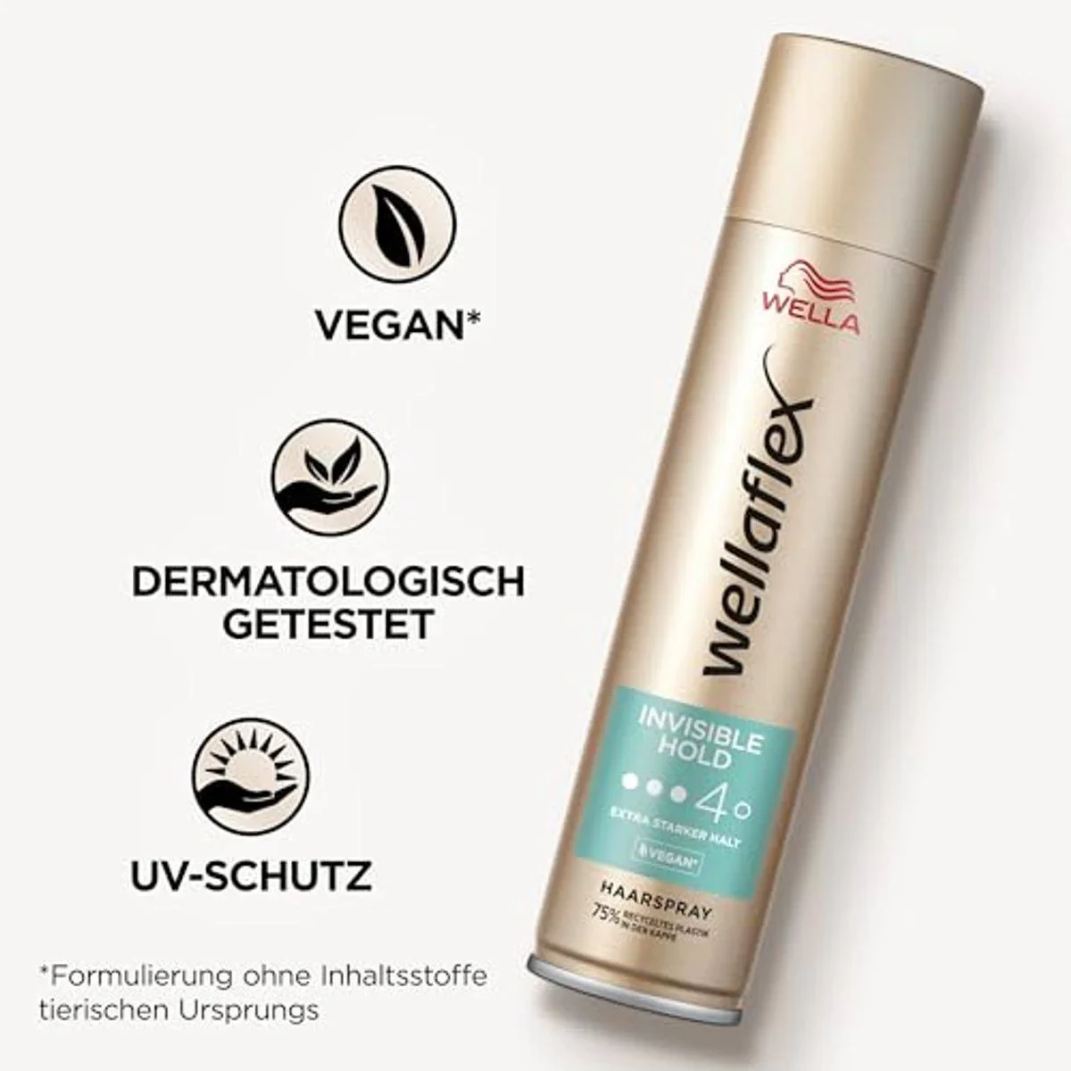 Wella Wellaflex Invisible Hold Hairspray provides extra strong hold for up to 48 hours. Its vegan formula is gentle on the scalp and offers UV protection. Ideal for maintaining a natural look without stickiness. Key Features Extra strong hold up to 48 hours Invisible hold for natural look Vegan formula UV protection Gentle to scalp Dermatologically tested Flexible styling Non-sticky feel Dimethyl Ether, Alcohol Denat., Octylacrylamide/Acrylates/Butylaminoethyl Methacrylate Copolymer, Aqua/Water/Eau, Aminomethyl Propanol, PEG-12 Dimethicone, Fragrance/Parfum, Acrylates/t-Butylacrylamide Copolymer, VP/VA Copolymer, Isopropyl Alcohol, Linalool, Triethyl Citrate, Hexyl Cinnamal, Citronellol, Limonene, Benzyl Salicylate.Wella: Innovators in hair care, known for professional styling products and solutions.Spray onto dry hair from a distance of approximately 30 cm.Dermatologically tested for ultimate skin safety.