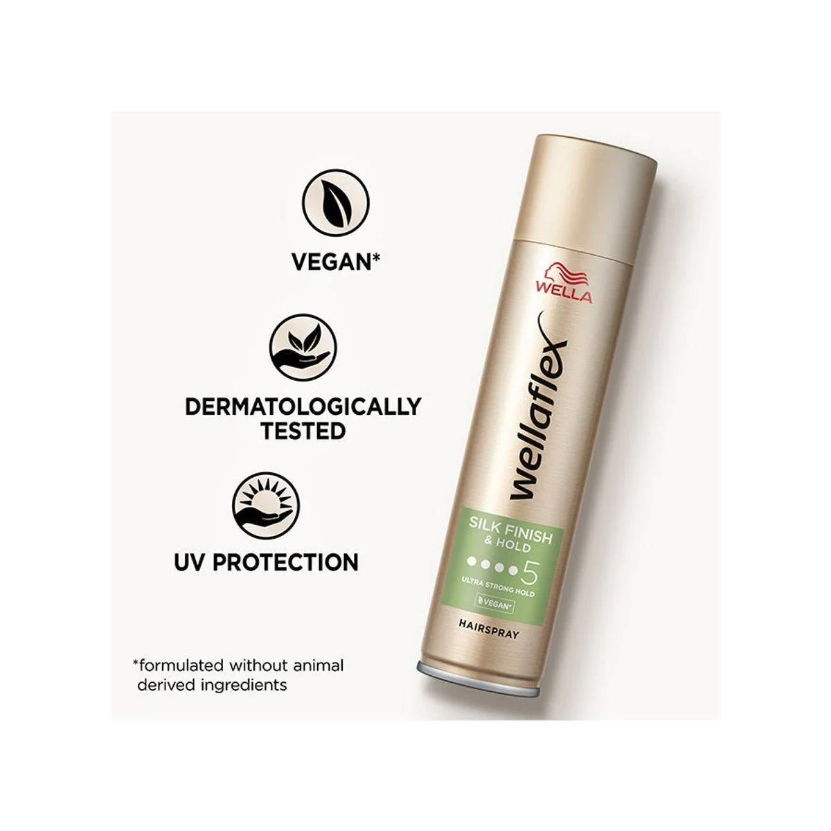 Wella Wellaflex Silk Finish & Hold Hairspray provides up to 48-hour hold with a flexible, lightweight feel. Dermatologically tested and vegan, it offers UV protection for a natural hair feel. Key Features Flexible & lightweight ultra strong hold Natural hair feel Gentle to scalp Up to 48H hold Vegan formulation Dermatologically tested UV protection Key Ingredients: Alcohol Denat., Butane/Propane (Propellants), Fixing Polymers, Fragrance, Silk Extracts.Wella: Innovators in hair care, offering professional-grade styling products.Hold Can 20-30 Cm From Hair And Spray Evenly.Extremely Flammable Aerosol. Pressurized container: Do not pierce or burn. Keep away from heat/open flames. Do not expose to temperatures exceeding 50?C. Avoid spraying in eyes.