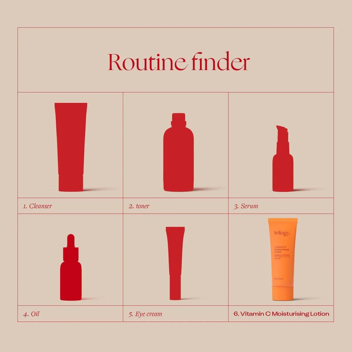 Aqua, Coco Caprylate, Prunus Amygdalus Dulcis (Sweet Almond) Oil, Aloe Barbadensis Leaf Juice, Cetearyl Alcohol, Glyceryl Stearate Se, Glycerin (Vegetale), Bellis Perennis Flower Extract, Rosa Canina Seed Oil, Ascorbic Acid (Vitamin C), Cetearyl Wheat Straw Glycosides (And) Cetearyl Alcohol, Sodium Stearoyl Glutamate, Citrus Nobilis (Mandarin Orange) Peel Oil, Tocopheryl Acetate, Xanthan Gum, Fragrance, Benzyl Alcohol, Hydroxy Citronellal, Eugenol, Cumarin, Geraniol, Linalool, Hexyl Cinnamal, Limonene, Caprylhydroxamic Acid, Benzyl Alcohol.Trilogy: Certified organic skincare with pure, natural ingredients.Massage a small amount into cleansed face, neck, and décolletage morning/evening.