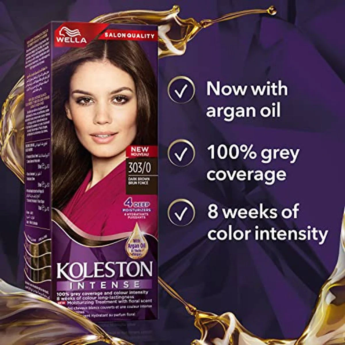 Wella Koleston Intense Hair Color 303/0 Dark Brown offers professional-quality hair color with 100% gray coverage and vibrant, long-lasting results. Enriched with argan oil and deep moisturizers, it nourishes and hydrates hair, leaving it shiny and healthy. Easy to apply at home, it provides a salon-quality finish. Key Features 100% grey coverage Long-lasting color up to 8 weeks Moisturizing treatment with argan oil Deep conditioning benefits Easy to apply, non-drip formula Para-phenylenediamine, Resorcinol, Aqua, Cetearyl Alcohol, Propylene Glycol, Ammonium Hydroxide, Fragrance.Wella: Experts in professional hair color and care, known for innovative formulas and vibrant results.Mix the colorant and developer as instructed in the kit. Apply evenly to dry, unwashed hair, focusing on the roots first, then through to the ends. Leave on for the recommended time, then rinse thoroughly.Perform a patch test 48 hours prior to use. Avoid contact with eyes. Keep out of reach of children.