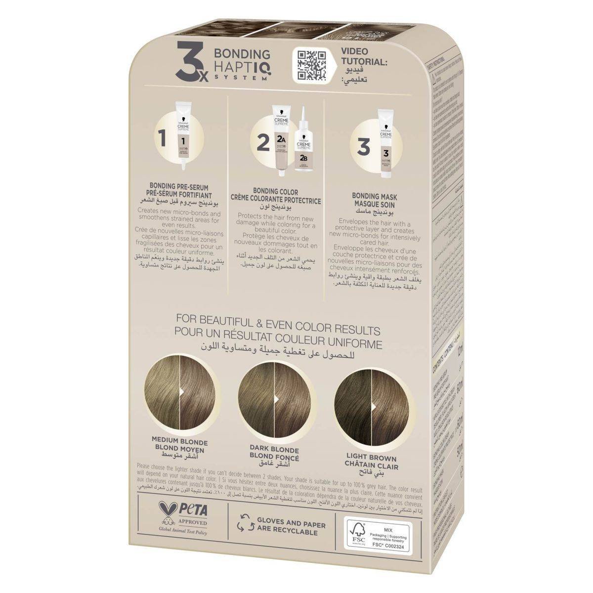 Aqua (Water), Cetearyl Alcohol, Ammonium Hydroxide, Coconut Alcohol, Sodium Laureth-6 Carboxylate, Sodium Myreth Sulfate, Ammonium Sulfate, Succinic Acid, Bis-Diisopropanolamino-PG-Propyl Dimethicone/Bis-Isobutyl PEG-14 Copolymer, Acrylamidopropyltrimonium Chloride/Acrylates Copolymer, Coco-Glucoside, Paraffinum Liquidum (Mineral Oil), Glyceryl Oleate, Arginine, Lysine HCl, Ceteareth-12, Ceteareth-20, Parfum (Fragrance), Potassium Hydroxide, Sodium Sulfite, Sodium Silicate, Etidronic Acid, Ascorbic Acid, Sodium Chloride, Butyloctanol, Citric Acid, Polysorbate 20, Linalool, Toluene-2,5-Diamine Sulfate, Phenoxyethanol, Benzyl Salicylate, Lactic Acid, Resorcinol, Citronellol, Geraniol, Limonene, Ethyl 2,2-Dimethylhydrocinnamal, Sodium Benzoate, Benzyl Alcohol, 4-Amino-2-Hydroxytoluene, 1,3-Bis-(2,4-Diaminophenoxy) Propane HCl, m-Aminophenol, Methylparaben, Ethylparaben.Schwarzkopf: Pioneers in hair care and color innovation, offering professional quality products for vibrant and healthy hair.Apply bonding pre-serum, mix and apply bonding color cream, finish with bonding hair mask.Do an allergy alert test 48 hours upfront.