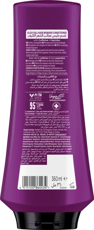 Schwarzkopf Gliss Full Hair Wonder Conditioner is designed for weak and falling hair, enriched with Caffeine and Peptides to strengthen hair from root to tip. It reduces breakage and hair loss by up to 90% with regular use, providing a smooth, shiny appearance. Key Features