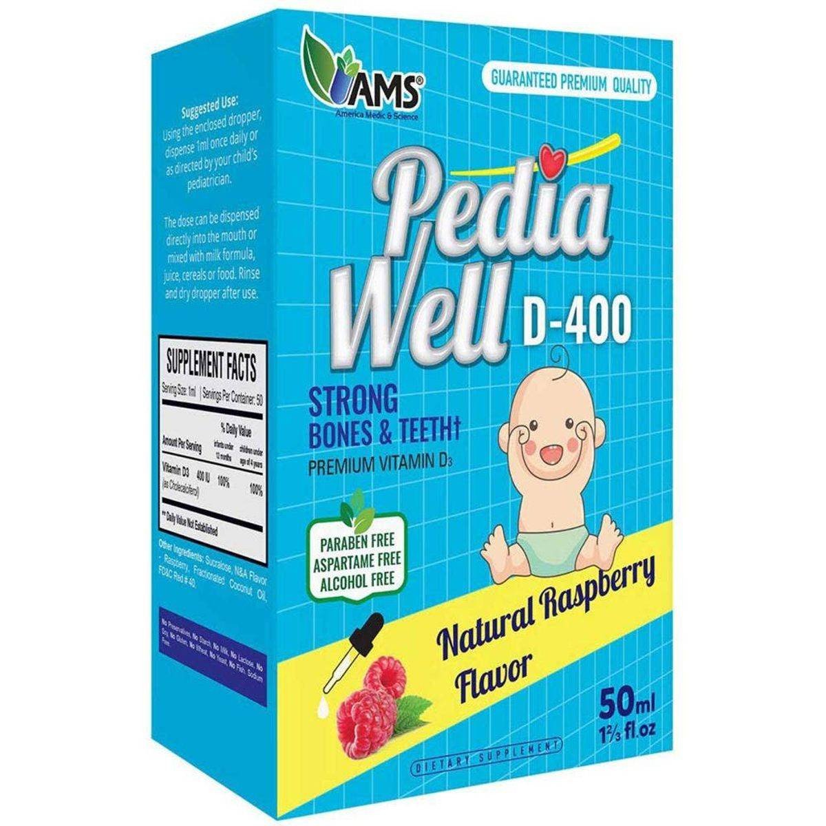 AMS Pedia Well D-400 is a dietary supplement designed to provide children with a daily dose of 400 IU of Vitamin D. It supports the development of strong bones and teeth by enhancing calcium absorption. The product is alcohol-free and features a natural raspberry flavor, making it enjoyable for kids. Key Features Supports strong bones and teeth Daily dose of 400 IU Vitamin D Alcohol-free Natural raspberry flavor Manufactured under high standards Suitable for children Enhances calcium absorption Supports healthy immune system Sucralose, Natural Raspberry Flavor, Fractionated Coconut Oil, FOS, Red #40.AMS is a trusted name in healthcare, offering premium quality vitamins and supplements for strong bones and teeth.Using the enclosed dropper, dispense 1ml once daily or as directed by your child's pediatrician. The dose can be dispensed directly into the mouth or mixed with milk, formula, juice, cereals, or food. Rinse and dry dropper after use.In case of an accidental overdose, call a doctor or poison control. Keep out of reach of children.
