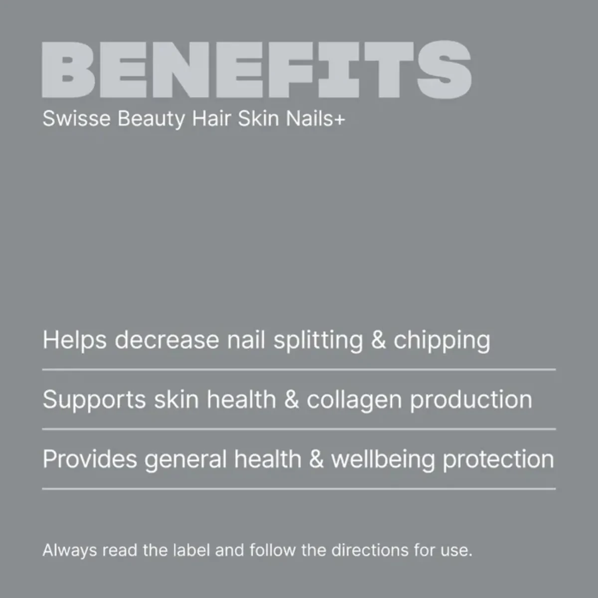 Transform your beauty routine with Swisse Beauty Hair Skin Nails+. One of our beauty bestsellers, this supplement is packed with nutrients like biotin, silica, zinc, and vitamin C. Biotin maintains strong nails, reducing breakage and splitting and supports healthy hair. Silica supports connective tissue health, while vitamin C maintains collagen production, skin firmness and healthy radiant skin. The inclusion of zinc adds extra richness to maintain wound healing and skin health. Every tablet of Swisse Beauty Hair Skin Nails+ is a step towards embracing your beauty from within. Full Ingredients (Active): Biotin (2.6 mg), Silicon (40 mg), Zinc (30 mg), Iron (10 mg), Vitamin C (100 mg), Foeniculum Vulgare (Fennel) Extract. Other: Microcrystalline Cellulose, Tablet Coating, Magnesium Stearate.An Australian wellness brand, founded in 1969, specializing in premium, science-backed vitamins, supplements, and beauty blends for holistic health and happiness.Take one tablet daily, during or immediately after a meal, or as directed by a healthcare professional.If pregnant, nursing, or taking any medications, consult a healthcare professional. Contains Zinc which may be dangerous if taken in large amounts for a long period.