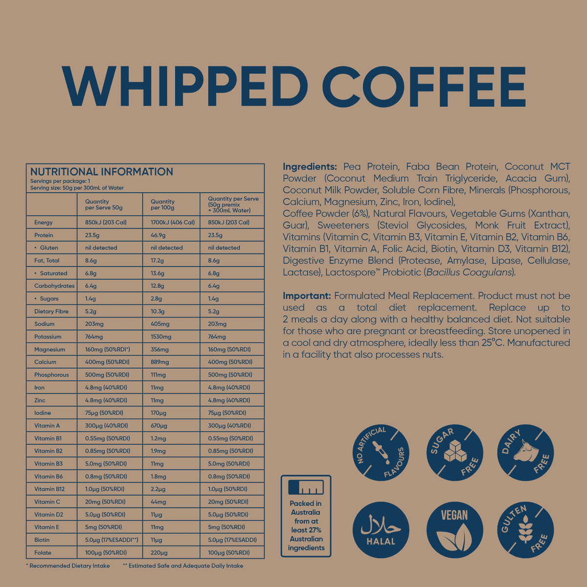 Pea Protein, Faba Bean Protein, Coconut MCT Powder (Coconut Medium Train Triglyceride, Acacia Gum), Coconut Milk Powder, Soluble Corn Fibre, Minerals (Phosphorous, Calcium, Magnesium, Zinc, Iron, Iodine), Coffee Powder (6%), Natural Flavours, Vegetable Gums (Xanthan, Guar), Sweeteners (Steviol Glycosides, Monk Fruit Extract), Vitamins (Vitamin C, Vitamin B3, Vitamin E, Vitamin B2, Vitamin B6, Vitamin B1, Vitamin A, Folic Acid, Biotin, Vitamin D3, Vitamin B12), Digestive Enzyme Blend (Protease, Amylase, Lipase, Cellulase, Lactase), Lactospore Probiotic (Bacillus Coagulans).Innovative meal replacement brand known for plant-based shakes with essential vitamins and minerals.Add 1 sachet to 300ml of cold water. Shake until completely dissolved. Consume immediately.Important: Formulated Meal Replacement. Product must not be used as a total diet replacement. Replace up to 2 meals a day along with a healthy balanced diet. Not suitable for those who are pregnant or breastfeeding. Store unopened in a cool and dry atmosphere, ideally less than 25°C. Manufactured in a facility that also processes nuts.