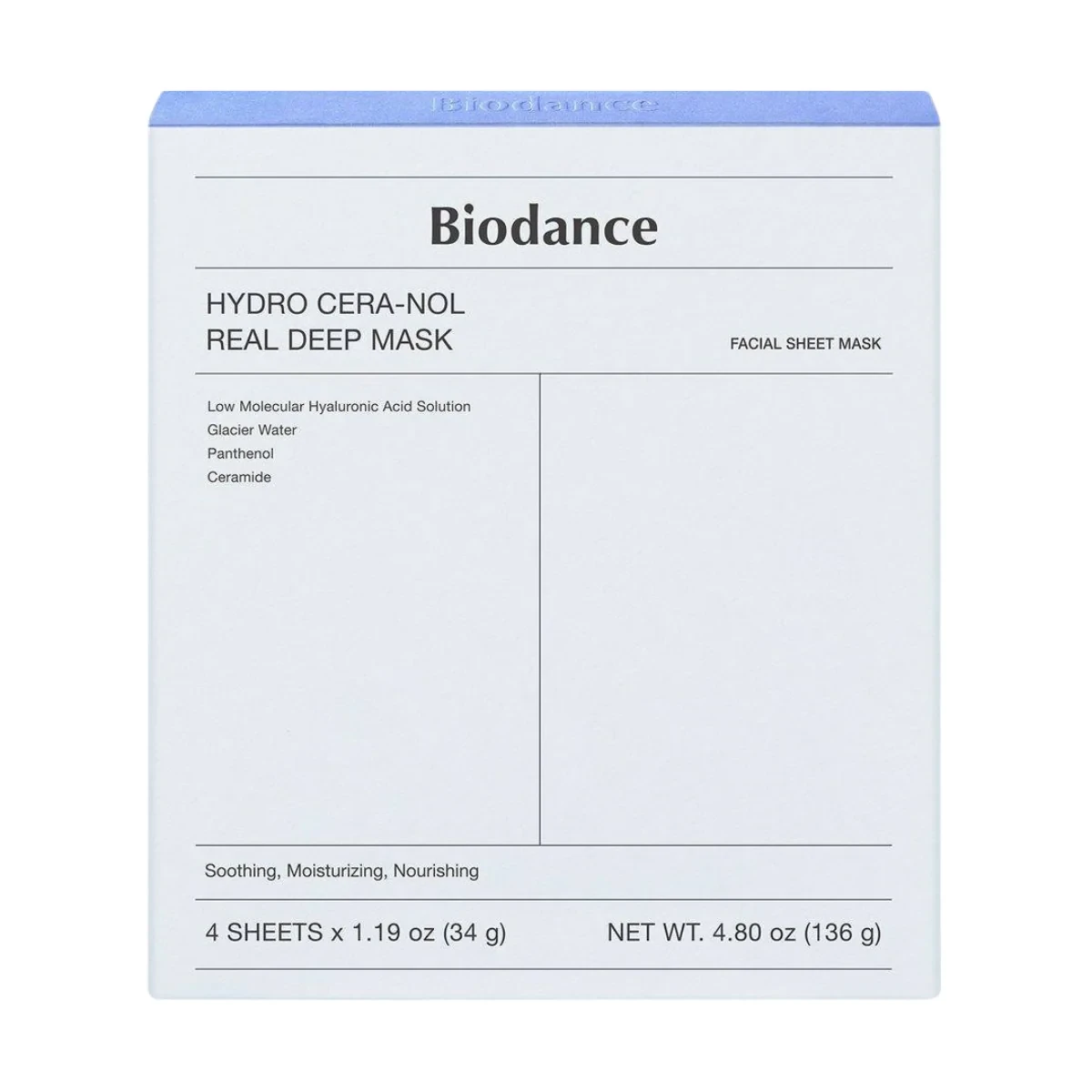 The Biodance Hydro Cera-Nol Real Deep Mask is a hydrogel mask designed for deep hydration and soothing of sensitive skin. Infused with Hydro Cera-nol and Glacial Water, it strengthens the skin barrier and improves elasticity. Ideal for reducing redness and irritation, it is suitable for all skin types.