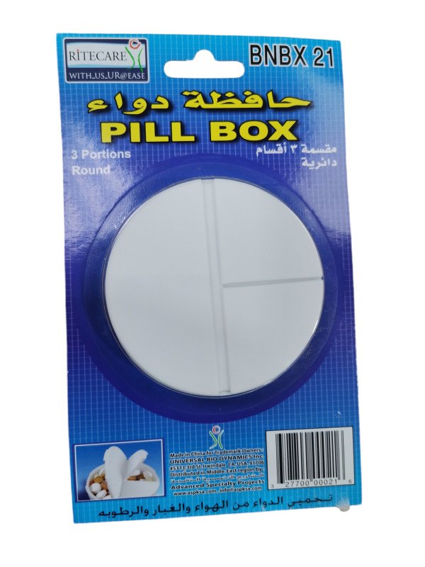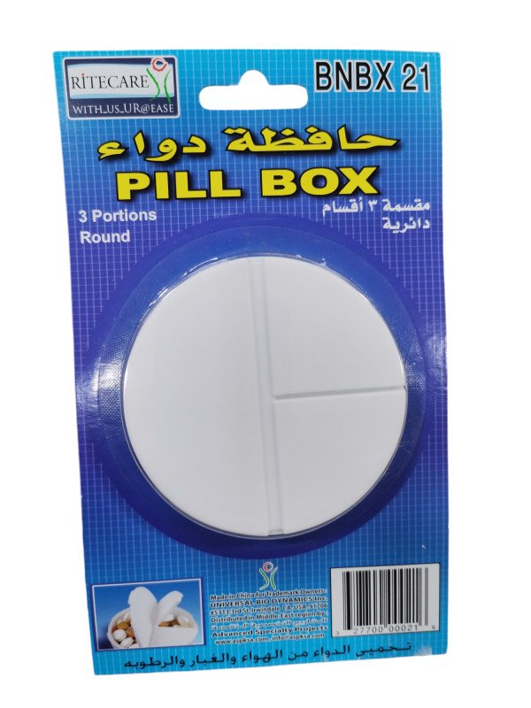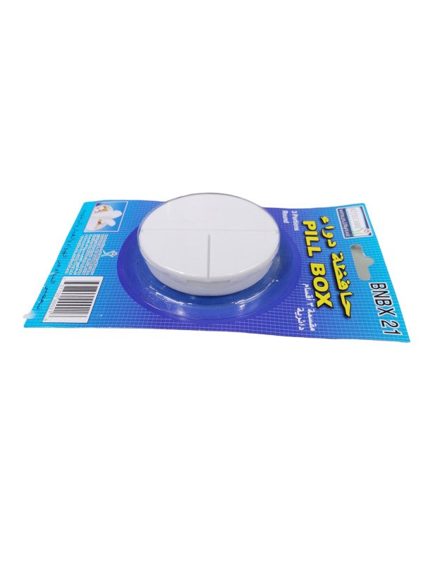 حافظة دواء مقسمة إلى 3 أقسام دائرية، مثالية لتنظيم الأدوية المختلفة.