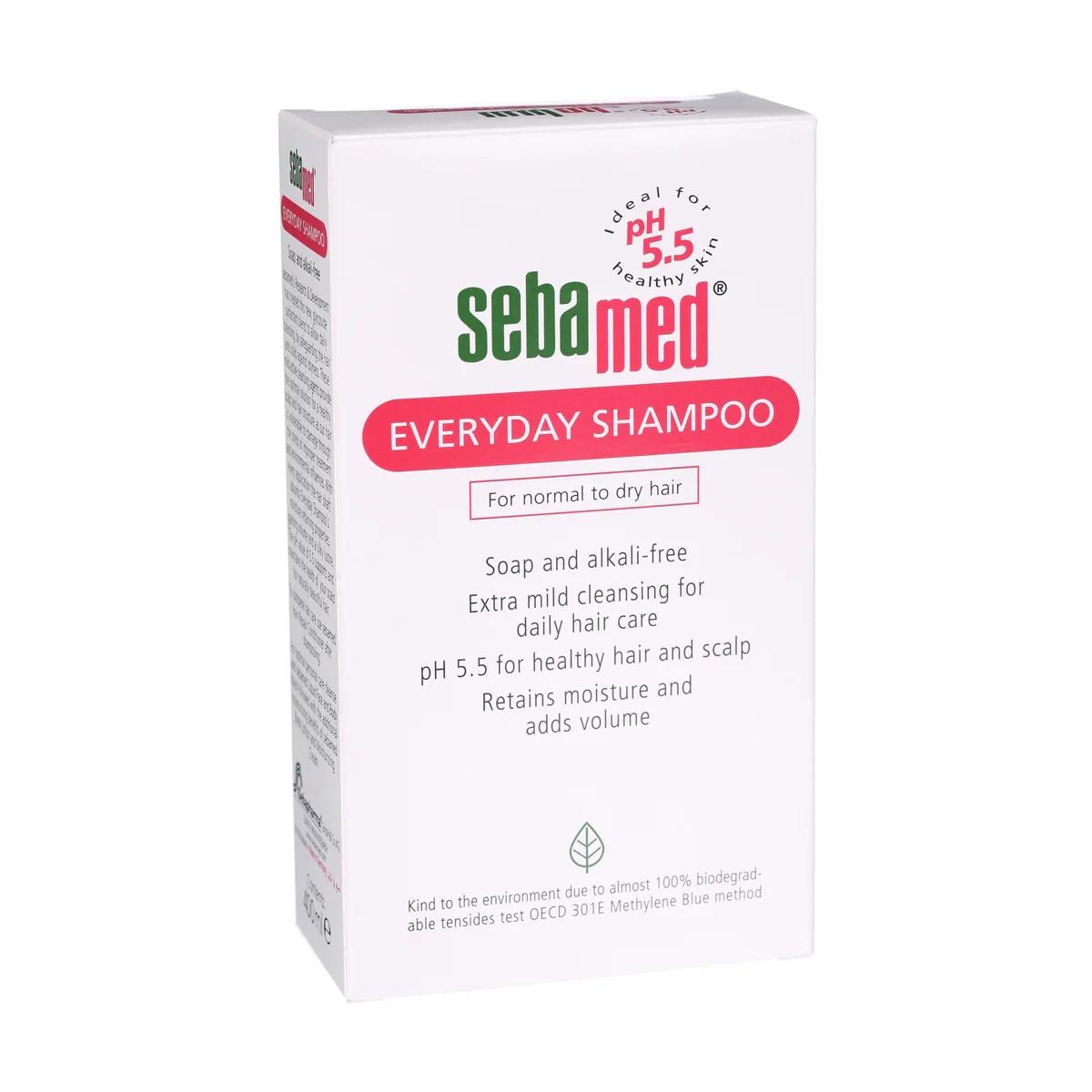 Sebamed Hair Care Everyday Shampoo is an ultra-mild formula designed for normal to dry hair. With a pH of 5.5, it supports the scalp's natural barrier, promoting healthy hair growth. Enriched with moisturizing ingredients, it adds softness, shine, and volume while reducing dryness and irritation. Perfect for daily use, it keeps your hair fresh, manageable, and well-nourished with every wash. Features Soap and alkali-free Extra mild cleansing for daily hair care pH 5.5 for healthy hair and scalp Retains moisture and adds volume Suitable for sensitive scalp Biodegradable tensides Aqua (Water), Decyl Glucoside, Disodium Laureth Sulfosuccinate, Sodium Lauryl Sulfoacetate, Peg-55 Propylene Glycol Oleate, Propylene Glycol, Parfum, Phenoxyethanol, Sodium Benzoate, Citric Acid, Hydroxypropyl Oxidized Starch, Lactic Acid.Leading skincare brand known for pH 5.5 balanced products that promote healthy skin and hair.Apply A Small Amount To Wet Hair, Massage Into The Scalp, Lather, And Rinse Thoroughly With Lukewarm Water. Repeat If Necessary.For external use only. Avoid contact with eyes.